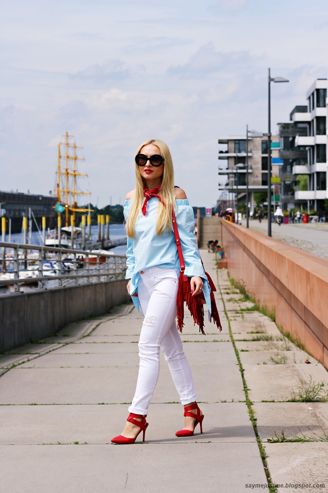 Off-Shoulder Trend ist einer meiner Lieblingstrends in dieser Saison, was ihr schon in diesem Post --> click erfahren konntet. Blusen und Kleider mit Carmen-Ausschnitt kann man fast überall finden, oft sind sie mit Rüschen, Gummibänder und Spitze verschönert, also ist es etwas für Fans von femininen Schnitten :) Der nächste Hit dieses Sommers sind Halstücher, bei so einem großen Ausschnitt ersetzen sie super den Schmuck und gleichzeitig peppen sie den ganzen Look auf, meine rote Bandana passt super zu den anderen Accessoire. So ist mein Tagesoutfit entstanden, elegant und locker in einem, so wie ich es mag :)