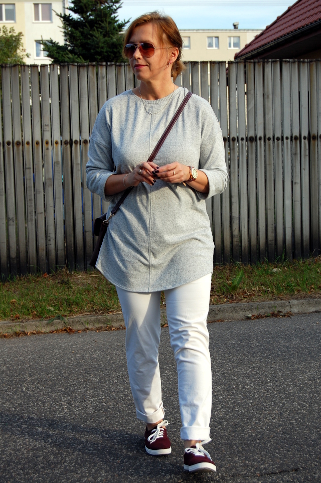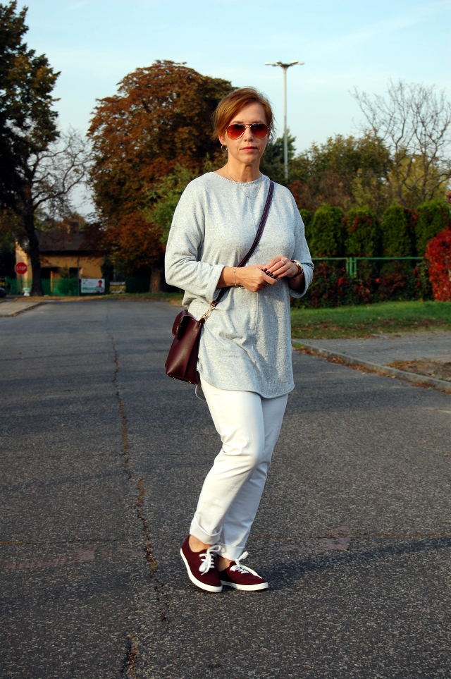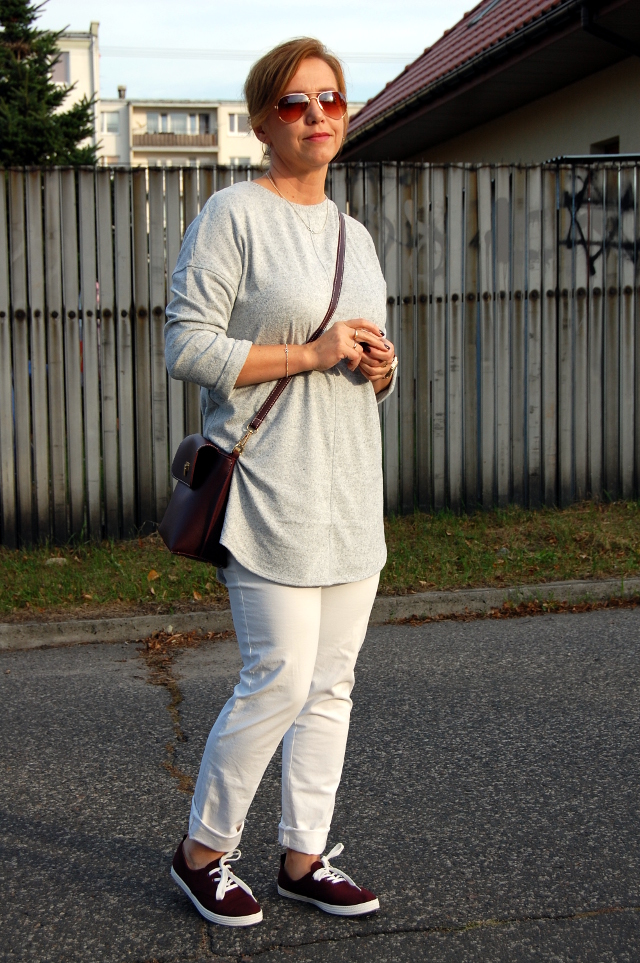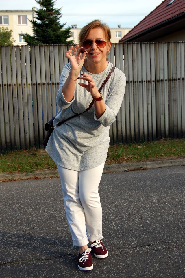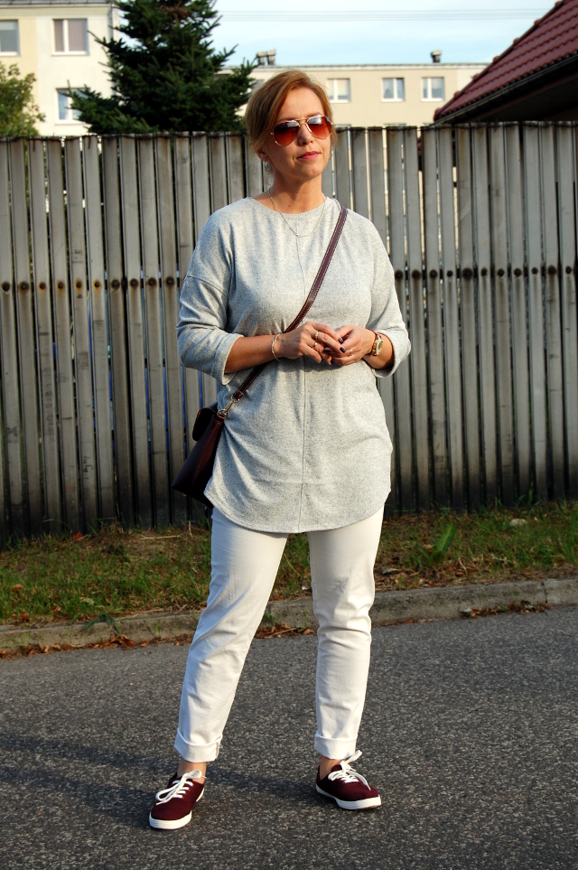 U mnie dziś granatowe slipony oraz bordowe tenisówki w towarzystwie białych spodni. Dwa zestawy na ciepłe jesienne dni, jakie ostatnio mamy. W pierwszym zestawie do spodni i sportowych butów, założyłam dzianinową tunikę w biało granatowe paski oraz granatowy lekki płaszcz. Do tego srebrzysta torba na łańcuszku i okulary przeciwsłoneczne.