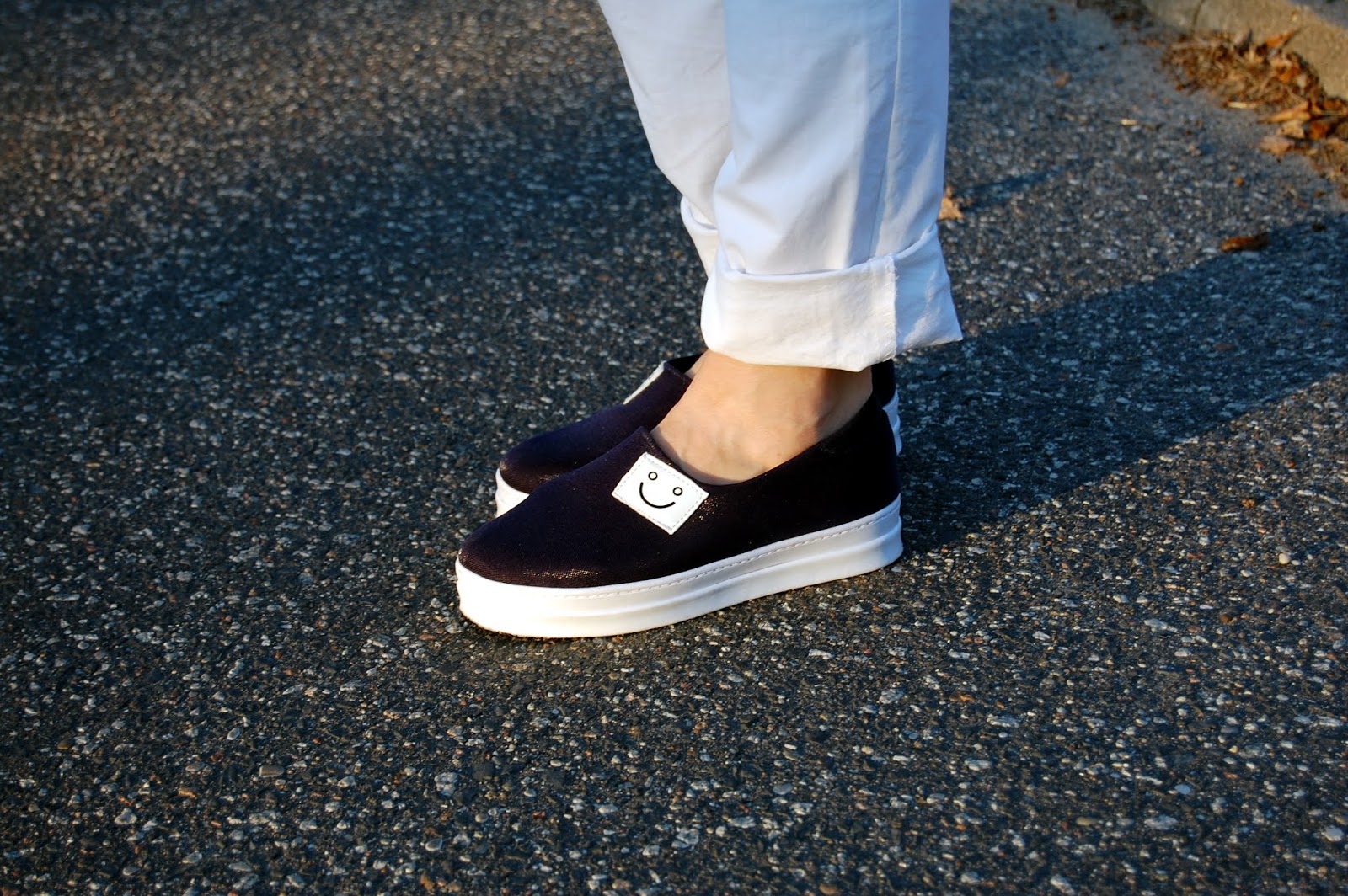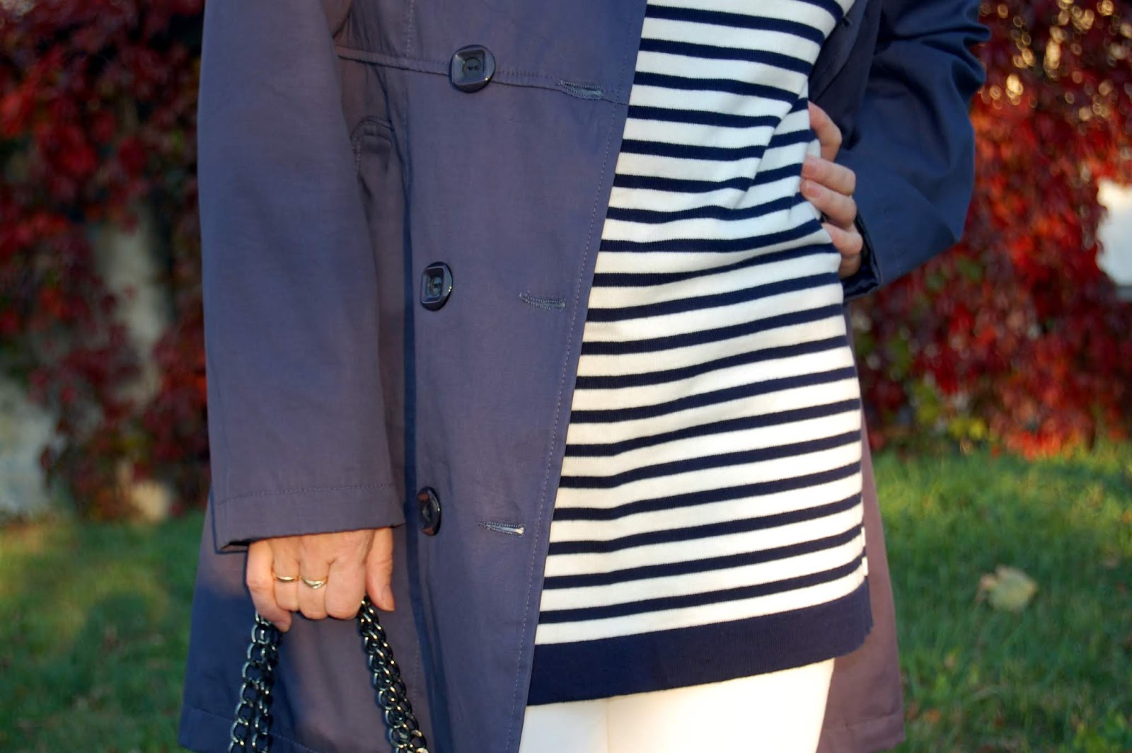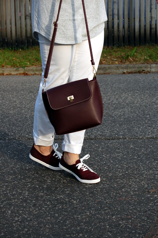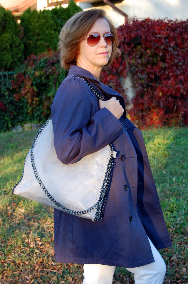U mnie dziś granatowe slipony oraz bordowe tenisówki w towarzystwie białych spodni. Dwa zestawy na ciepłe jesienne dni, jakie ostatnio mamy. W pierwszym zestawie do spodni i sportowych butów, założyłam dzianinową tunikę w biało granatowe paski oraz granatowy lekki płaszcz. Do tego srebrzysta torba na łańcuszku i okulary przeciwsłoneczne.