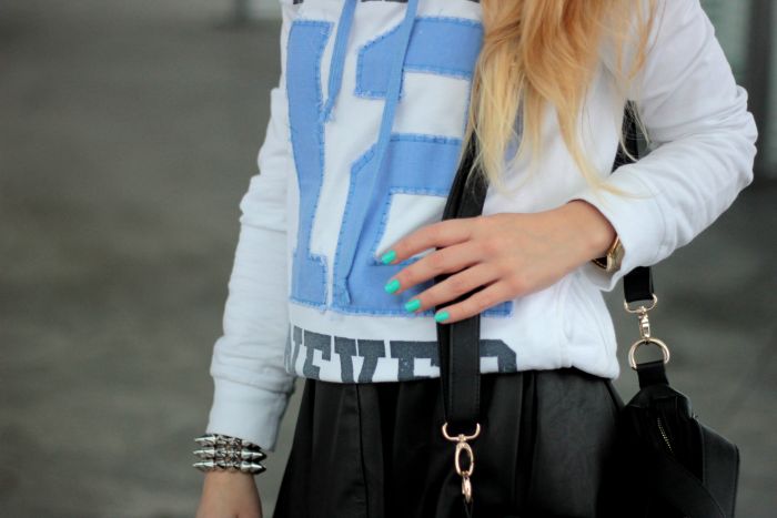 Połączenie sportowej bluzy i skórzanej eleganckiej spódnicy? Dlaczego nie!