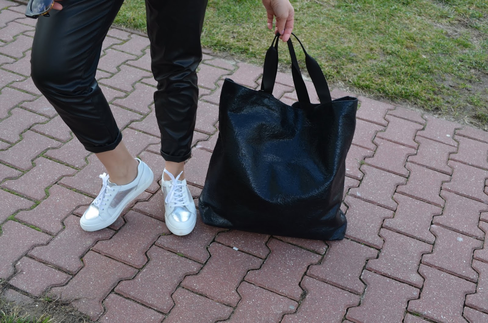 Dziś ubrałam spodnie o kroju dresowych, ze ściągaczem w pasie z eko skóry oraz dzianinową górę od dresu.