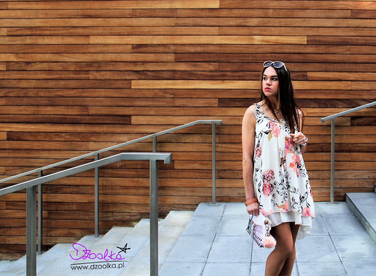 Wybrałam do niej sandały na obcasie w kolorze koralowym - identycznym jak kwiaty na sukience.