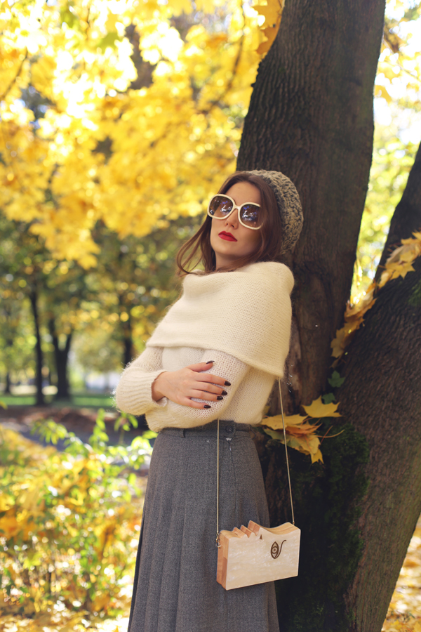 Spódnica: MAXMARA o Sweter: TUTAJ o Czapa: VINTAGE o Czółenka: TUTAJ o Kopertówka: TUTAJ o Okulary: CHLOE o Pazury: TUTAJ