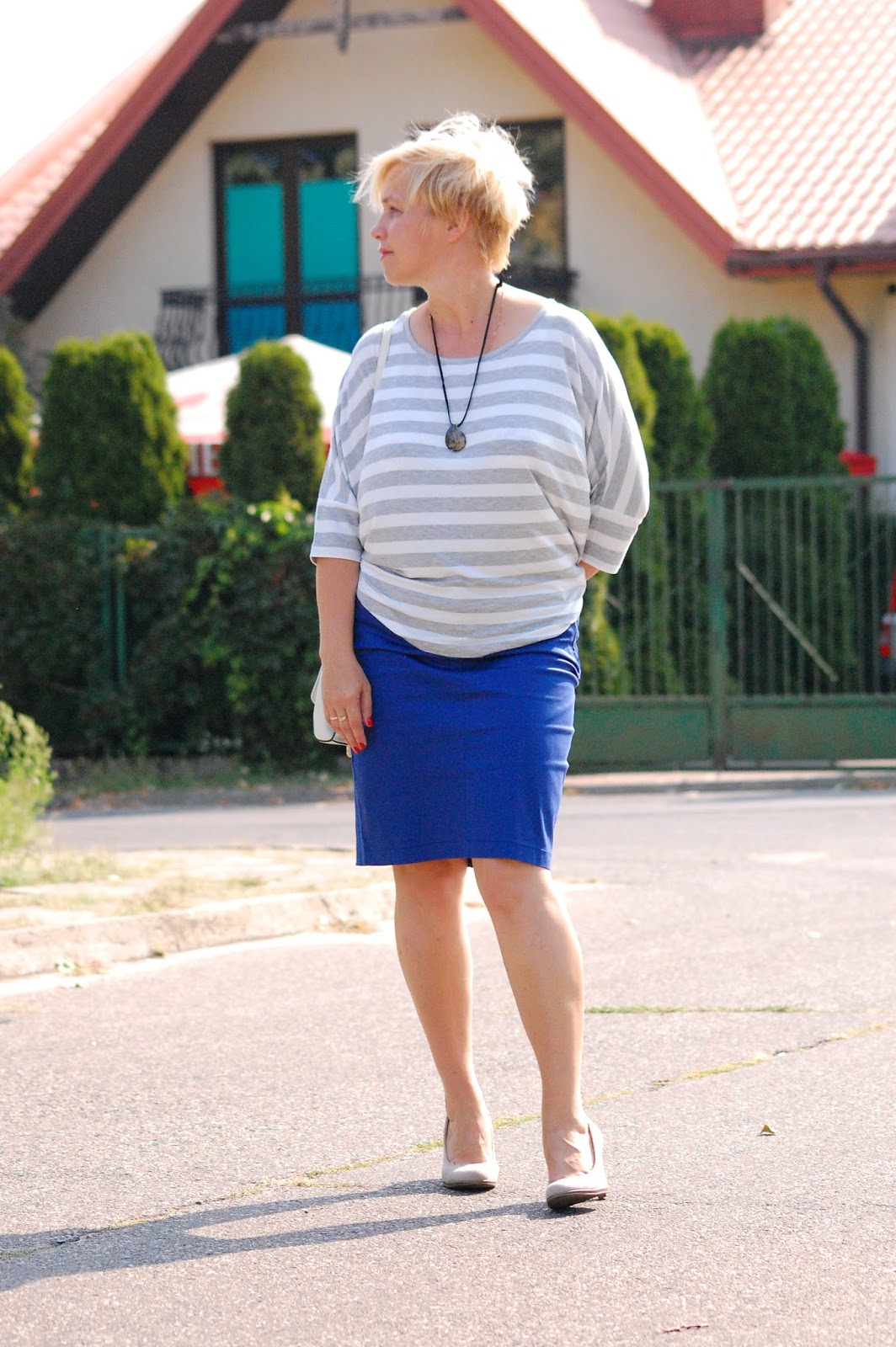 Dzisiejsza moja stylizacja to bluzka typu oversize, ołówkowa spódnica, szpilki i torebka. Bluzkę zakupiłam na wakacyjnym wyjeździe i była to ostatnia sztuka. Jest trzy rozmiary większa od tego który ja noszę, ale ponieważ ma taki pudełkowy fason nie jest to problemem. Poza tym bardzo mi się spodobała, a pani w sklepie powiedziała, że tak się teraz nosi. Do bluzki świetnie pasuje m.in. ołówkowa spódnica i taką też założyłam. Z biżuterii wisiorek, kamień w kształcie spadającej kropli wody. Kupiłam go kiedyś na turnieju rycerskim w Łęczycy. Przyjeżdżają tam wtedy różni artyści i średniowieczni kupcy i mają takie różne, oryginalne, ręcznie robione cacka.
