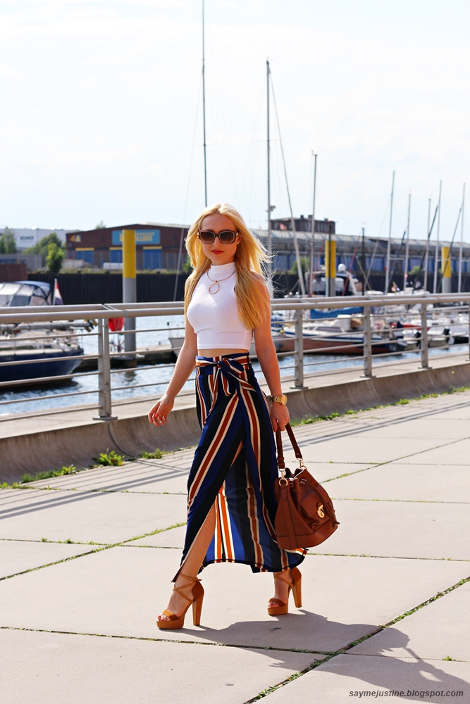 Heute stehen die Streifen im Vordergrund! Vielleicht sieht man es auf den ersten Blick nicht, aber ich trage keinen Rock, sondern eine Hose, die breit geschnitten ist und auf den Seiten Schlitze hat, übrigens betont sie super die Taille! Zu dieser Art der Hose sollte man am besten Schuhe mit Absatz wählen, damit man die Beine noch zusätzlich streckt. Ich bin gespannt auf eure Meinung:) Ich drücke euch und gehe schnell das Spiel weiter gucken!