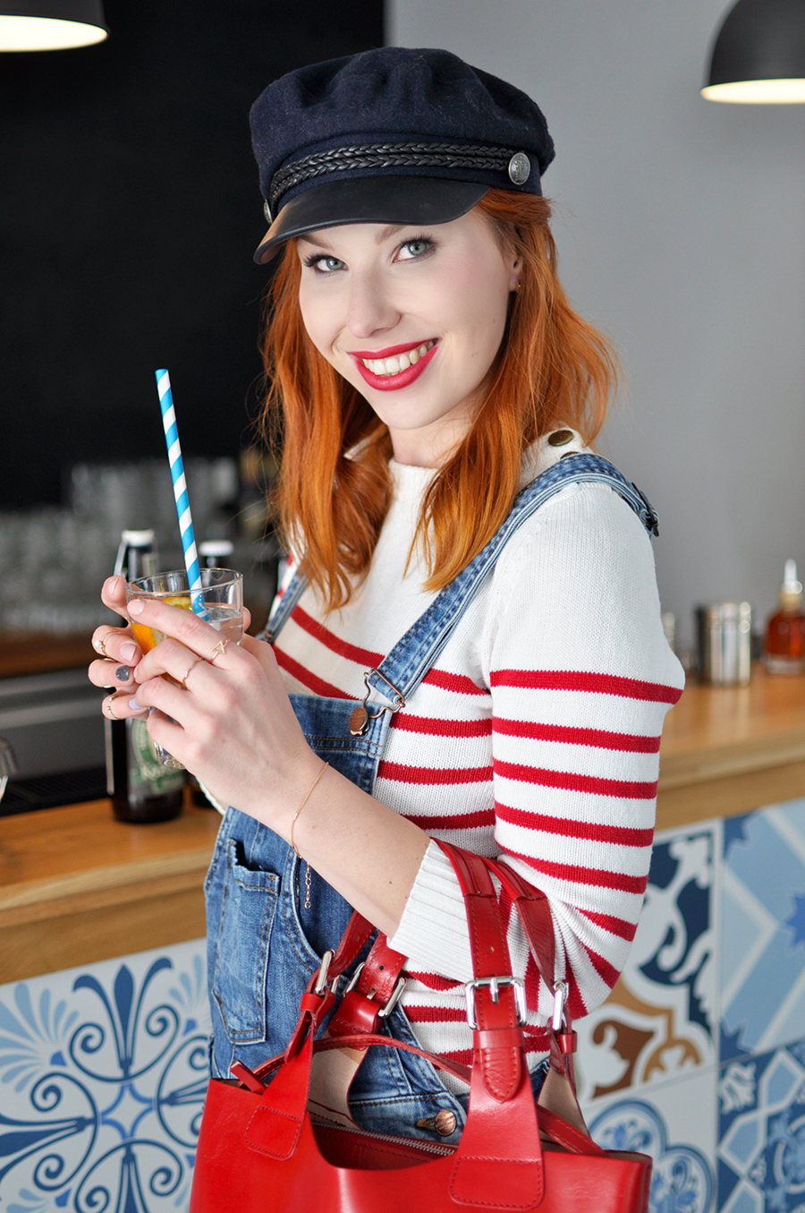 Sama się nad tym zastanawiałam, kiedy stałam przed wyborem stroju na lunch w Restauracji w Hotelu Wydma w Pobierowie. Taki wystrój wymagał współgrającej oprawy. Wiecie, że nie jestem zwolennikiem standardowych rozwiązań. Dlatego białe spodnie wydawały mi się zbyt zwyczajne. Wybrałam jeans i to okazało się być strzałem w dziesiątkę! Ogrodniczki wyglądają dobrze zarówno noszone na luzie, jak i w eleganckiej wersji. Dla przełamania kolorystyki dopasowałam czerwone paski. Zupełnie nie odbiegały od stylu marynistycznego, a idealnie pasowały do czerwonych szpilek i mojej nowej ulubionej torebki!