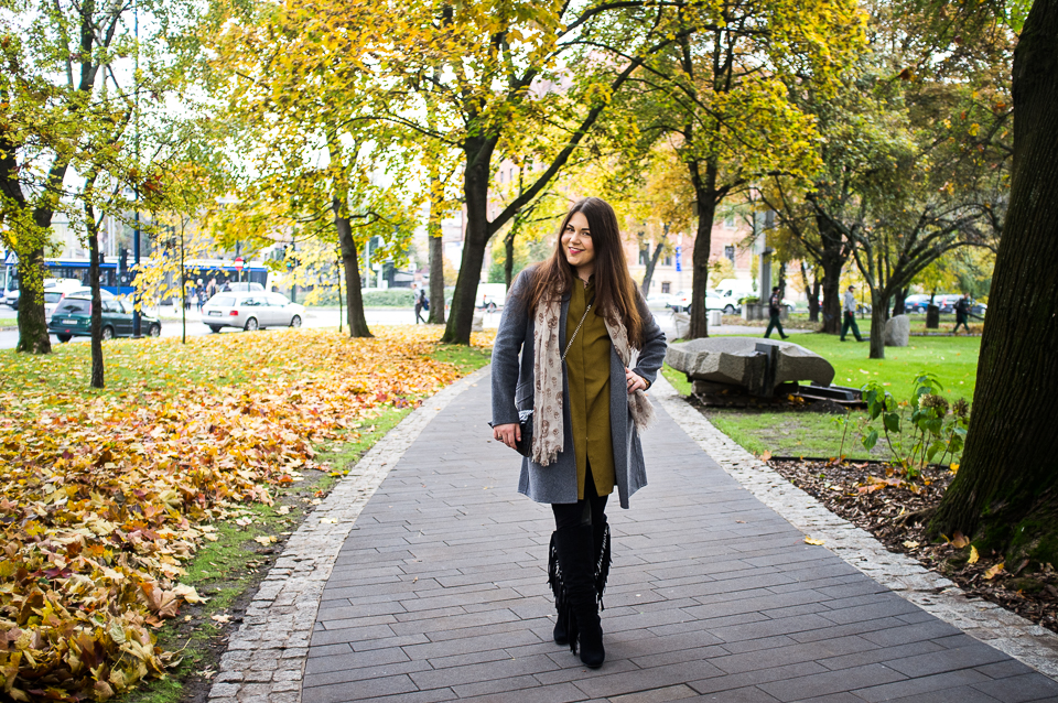 (Tak, tak, dobrze czytasz! Z letnimi miesiącami i upałami mi nie po drodze.) Wczesna wiosna i początek jesieni zawsze zachwycają mnie kolorami. To moje ulubione momenty w trakcie całego roku - także ze względu na modę. Pogoda sprzyja spacerom i... nadaje się idealnie do ubierania się w sposób warstwowy. To doskonały moment na to, by ulubioną ramoneskę czy trencz narzucić na letnią sukienkę lub tunikę, zdecydować się na buty z zamszu, kupić pierwszy w życiu kapelusz i codziennie zakładać inny szal, który może chronić nas przed wiatrem, ogrzać w chłodniejszy wieczór czy po prostu stanowić fajne urozmaicenie stylizacji. Na botki, skórzane kozaki i ocieplane płaszcze przyjdzie jeszcze czas. Odpowiednio założony długi, kaszmirowy sweter czy futrzana kamizelka sprawdzi się doskonale w duecie z koszulą z bardzo modnymi w tym sezonie rozszerzanymi, lekko za długimi rękawami. Jeżeli lubisz bezpieczne rozwiązania, zestawiaj ze sobą ubrania w podobnej tonacji. Jeśli lubisz się bawić kolorami możesz np. zderzyć ze sobą, tak jak ja cieplejsze kolory (w tym wypadku oliwkowa sukienko-tunika) z chłodniejszymi (szary płaszcz). Zderzenie temperaturowe może być dla Ciebie pomysłem na to, by nadać starym ubraniom drugie życie - trencz, który dotąd nosiłaś tylko z częścią pozostałej garderoby, teraz możesz zestawić w zupełnie nowy sposób. Niech zabawa modą i ubraniem będzie Twoim sposobem na jesienną chandrę! Pamiętaj, że wszystko zaczyna i kończy się w głowie, więc pozytywne nastawienie i skupienie się na rzeczach, które sprawiają nam radość i przyjemność mogą sprawić, że nadciągająca listopadowa szarówka nie da nam się we znaki. Jeżeli nie wiesz od czego zacząć, zadzwoń lub napisz do mnie - wspólnie popracujemy nad Twoim stylem i sprawimy, że ta jesień, będzie kolorowa <3