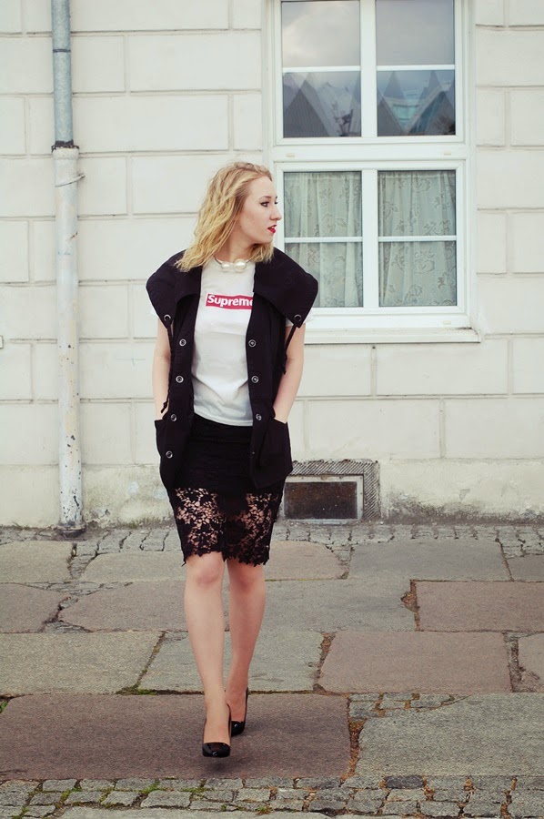 Zobacz oryginał wt., 15/07/2014 - 22:26Zawsze marzył mi się zakup bluzki supreme, będąc kilka lat młodszą. Kiedy patrzę na to, jak ubierałam się zaledwie 3/4 lata temu, na mojej buzi pojawia się ogromny uśmiech. W kilka lat zaszła u mnie tak spora metamorfoza. Młodość ma chyba to do siebie, że najchętniej chcielibyśmy zmieniać swoją całą szafę co kilka miesięcy. Całe szczęście - ja od ponad roku utrzymuję się w jednym konwencie i tylko dokupuję perełki, które chcę umieścić w mojej "kolekcji". Jednak wracając do koszulki - ostatnio znalazłam ją ponownie w internecie i od razu przed oczami miałam wizję połączenia ją z klasyczną elegancją. Jakiś czas temu pewnie połączyłabym ją z szortami i trampkami. Jak podoba wam się połączenie odzieży "sportowej" z "elegancką"? Podobno zwrot ''Sportowa Elegancja'' nie istnieje. Chyba nie mogę się tym zgodzić