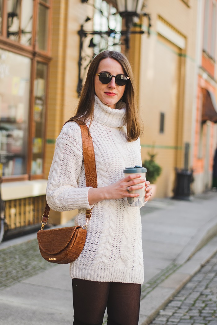 Dziś bardzo prosta stylizacja, wręcz zachowawcza - ale to właśnie takie zestawy najlepiej nosi się na co dzień. Swetrowa sukienka z dużym, wyraźnym splotem, do tego klasyczny płaszcz w beżowym kolorze oraz długie kozaki na platformie. Przystępny i łatwy do odtworzenia zestaw dla każdego, a jego plusem jest to, że sprawdzi się na wiele okazji.