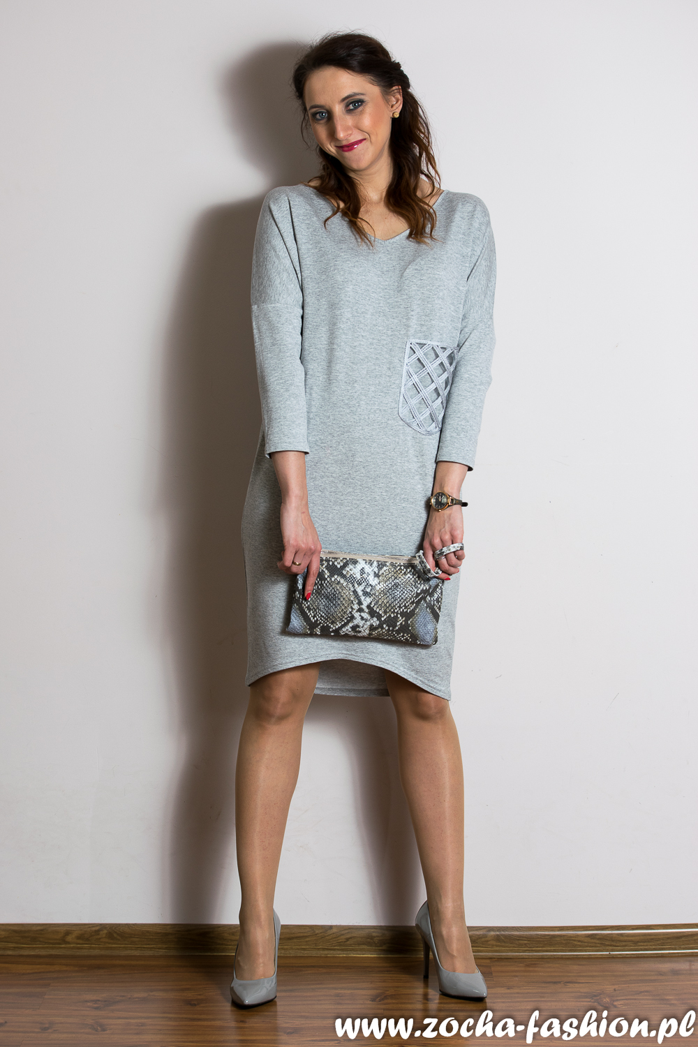 Zobacz oryginał śr., 09/03/2016 - 08:24Pewnie niektórzy z Was uznają, że szara sukienka to banał. Nic bardziej mylnego. Na pierwszy rzut oka prosta sukienka z ozdobną kieszonką na przodzie. Dopiero po pokazaniu pleców robimy wielkie wow. I prosta, niby banalna sukienka zmienia się w wyjątkową, oryginalną, kobiecą i bardzo seksowną rzecz. (Nie powiem chyba nic nowego, ale odkryte plecy działają na płeć przeciwną). Do tego czółenka w podobnym odcieniu co sukienka i kopertówka nawiązująca kolorystycznie do reszty w print wężowej skóry. Złote dodatki w postaci kolczyków i zegarka nadają klasy stylizacji. Jestem ciekawa gdzie byście tę propozycję najchętniej założyli. Ja mam parę pomysłów.
