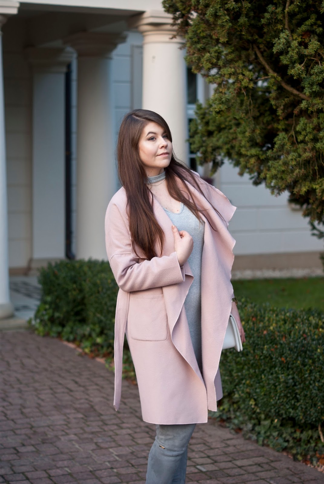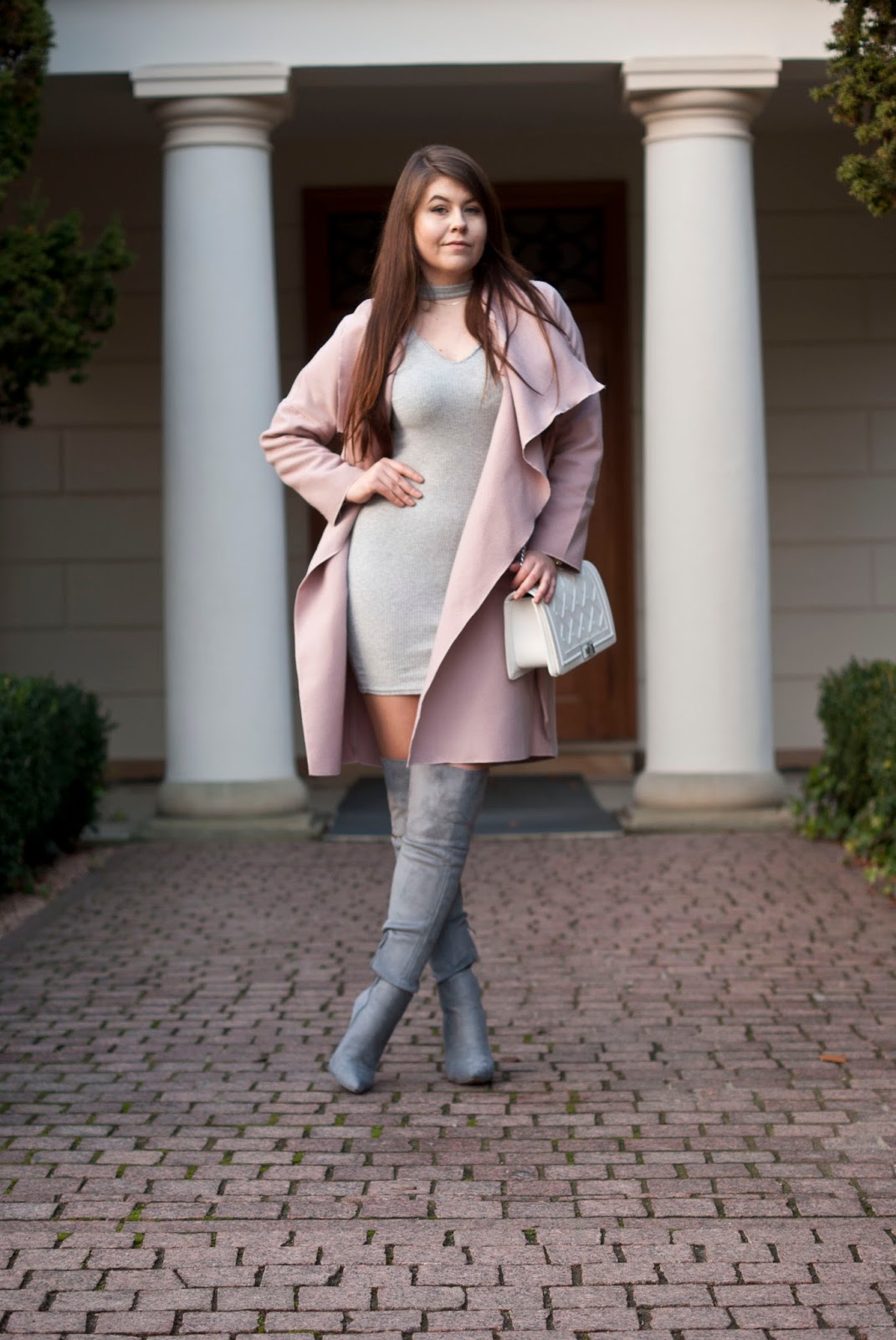 Przyjdą święta, sylwester czy też imprezy karnawałowe. Powoli czas zacząć myśleć co ubierzemy na te okazje. Moim zdaniem dzisiejsza propozycja nadaje sie na imprezę. Dziś wykorzystałam szarą dopasowaną sukienkę z chokerem do tego dobrałam szare kozaki za kolano w szpic ( teraz promocja jest na ebutik zaglądajcie ) . Do tego zarzuciłam mój ulubiony różowy płaszcz i dobrałam białą moją ulubioną torebkę. Mam nadzieje że wpadnie wam w oko ;).