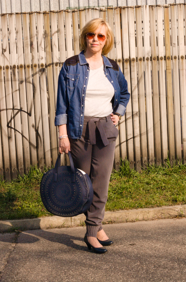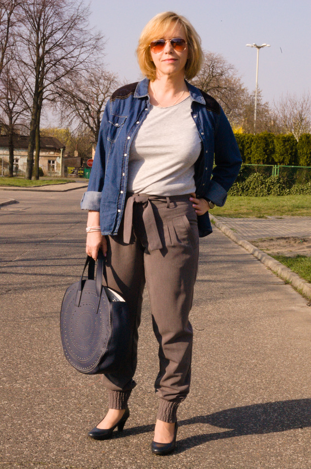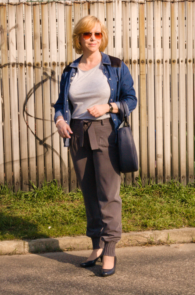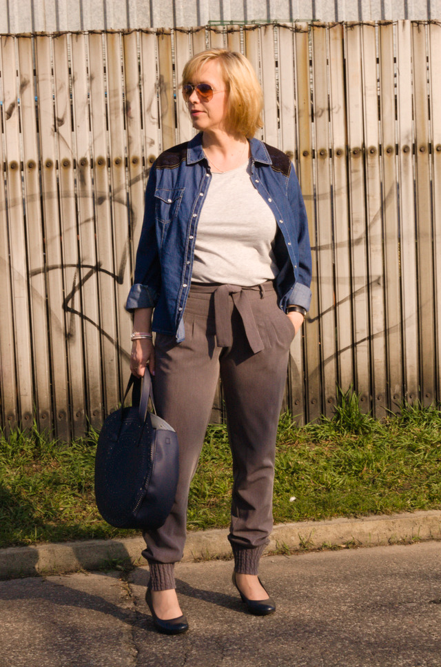 Cały zestaw utrzymałam w szaro granatowej kolorystyce. Do spodni założyłam zwykły szary t-shirt oraz narzuciłam na wierzch cienką dżinsową koszulę. Do tego granatowe czółenka na niewysokim obcasie oraz wyjątkowa torebka. Z innych dodatków jest srebrno różowa bransoletka i okulary przeciwsłoneczne.
