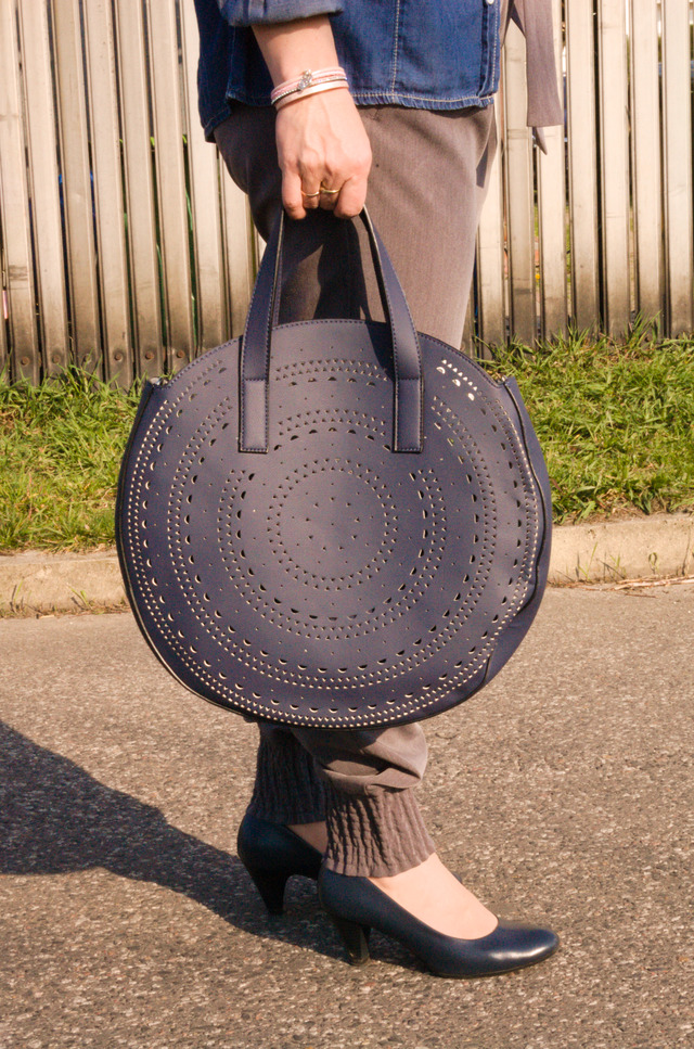 Zobacz oryginał ndz., 07/04/2019 - 18:55 Szare spodnie z wiązaniem w pasie są dziś tym numerem jeden. Choć tak do końca nie jestem pewna, bo okrągła, granatowa torebka z laserowo wyciętym wzorem, również przyciąga wzrok. Obie te piękne rzeczy nabyłam w Bonprix.