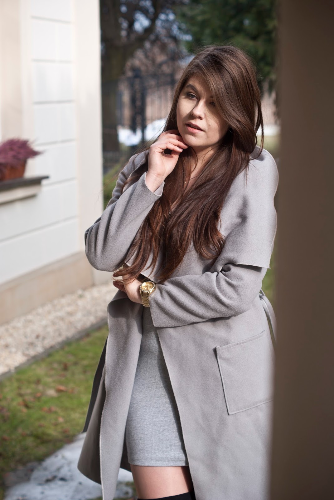 Dziś szara sukienka szary płaszcz i czarne kozaki.