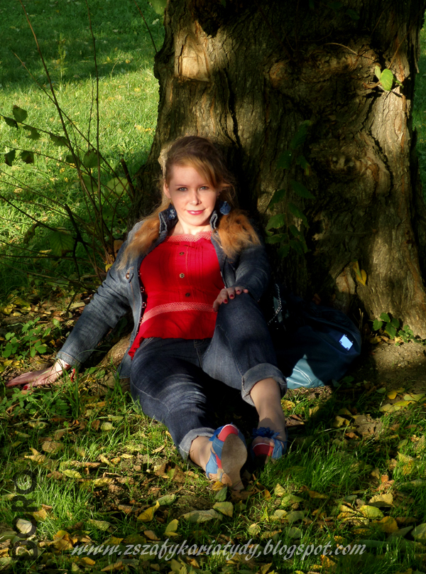 Sesja, którą zrobiłam z moją przyjaciółką była propozycją na ubiegłoroczną gorącą jesień i kto by przypuszczał, że tegorocznego lata również będzie jak znalazł. Postanowiłam połączyć dwa skrajne kolory, mianowicie ciemny granat i soczystą czerwień. Nie wiem czy unikacie może takich połączeń ale ja je bardzo lubię kontrast jest pożądany w modowych stylizacjach. Zatem przedstawiam Wam zestaw red&blue jaki udało mi się wykombinować. Zacznę od góry. Mam na sobie ciemno niebieską kurtkę, o bardzo ciekawym kroju ze stojącym kołnierzem, która jest zapinana na haczyki dlatego idealnie opina sylwetkę, dzięki czemu wygląda się smuklej w takim modelu. Wykończona jest bardzo fajnymi dużymi miedzianymi guzikami na rękawach i w klapie kołnierzyka. Kurtka jest marki "Love Jeans" całkiem udany zakup, bo pasuje również do jeansowych spódniczek. Bawiąc się zasadą kontrastu w dzisiejszej stylizacji wyszukałam w mojej szafie karminową koszulę. Bardzo ją lubię kupiłam ją kilka lat temu przypadkowo w Biedronce i nie żałuję. Ma długi rękaw wiązany na tasiemki i szalenie kobiecy krój. Zastanawiam się czy nosicie takie koszule. Ta, którą Wam prezentuję to tzw. baskinka, czyli bluzka z falbanką u dołu. Koszula tego typu jest wymarzona dla Pań o budowie ciała określanej jako "klepsydra" oraz dla osób o budowie ciała zbliżonej do "kolumny" lub "prostokąta". Dlaczego? Kształt falbanki sprawia, że optycznie uwypuklają się biodra a talia wydaje się bardziej szczupła. Jeżeli macie taką budową ciała proponuję częściej sięgać po baskinki, które ukrywają również niewielki brzuszek...pod warunkiem, że jest widoczny :) To tyle o trikach związanych z baskinką. Przejdźmy do dołu stylizacji. Ubrałam do tego zestawu denimowe jeansy z wysokim stanem. Ostatnio taki krój spodni wrócił do łask i bardzo się cieszę z tego powodu. Ponieważ nie zawsze spodnie kończące się na wysokości pępka pasują do każdej stylizacji. Nie mówiąc o budowie ciała. Jeżeli bluzka jest krótsza powinno się zastosować zdecydowanie taki model spodni.
