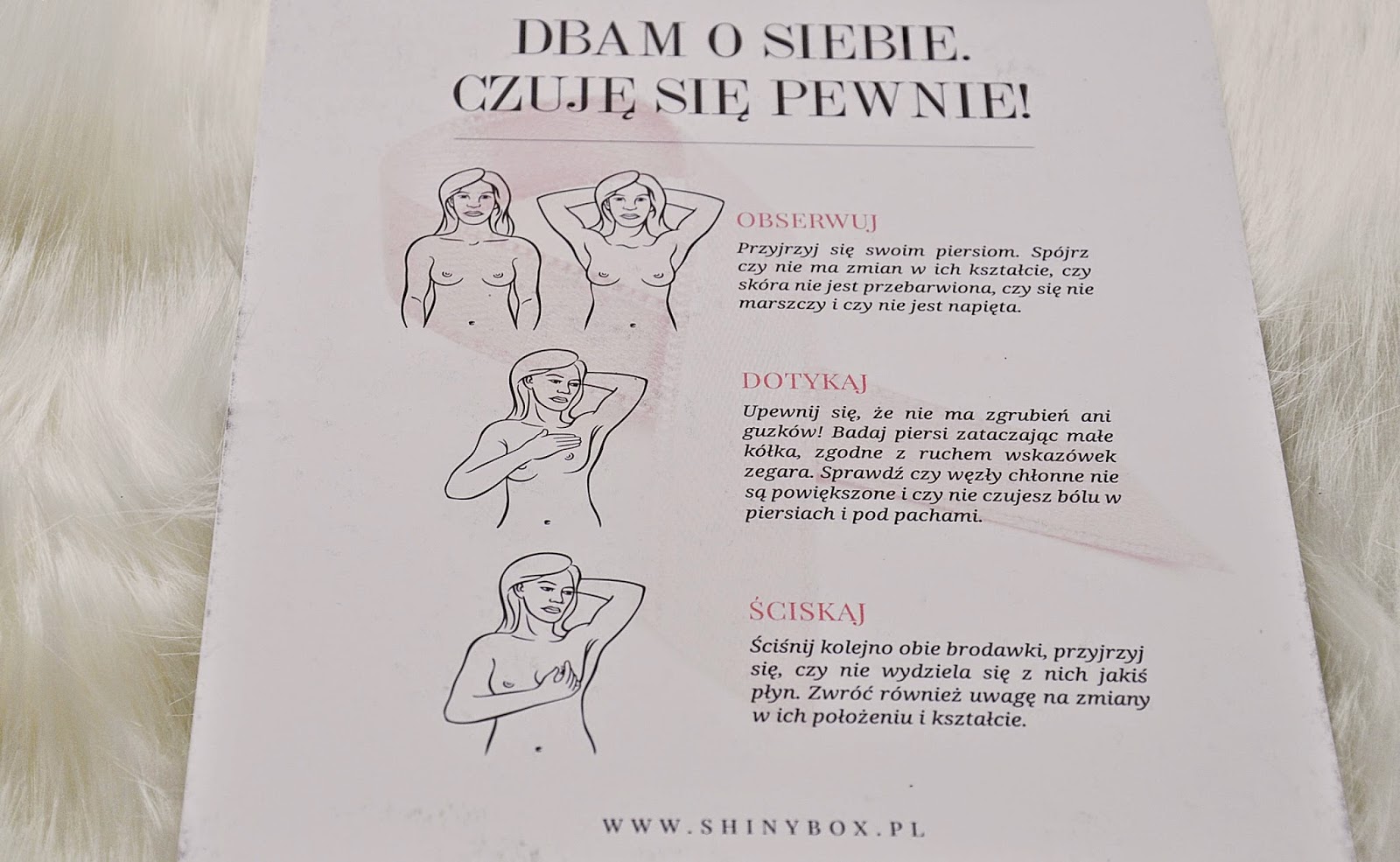 Zobacz oryginał wt., 28/10/2014 - 18:36Zanim opiszę po kolei produkty, muszę wspomnieć, że na uwagę zasługuje fakt, że wewnątrz znalazła się instrukcja samobadania piersi - moim zdaniem to strzał w 10!