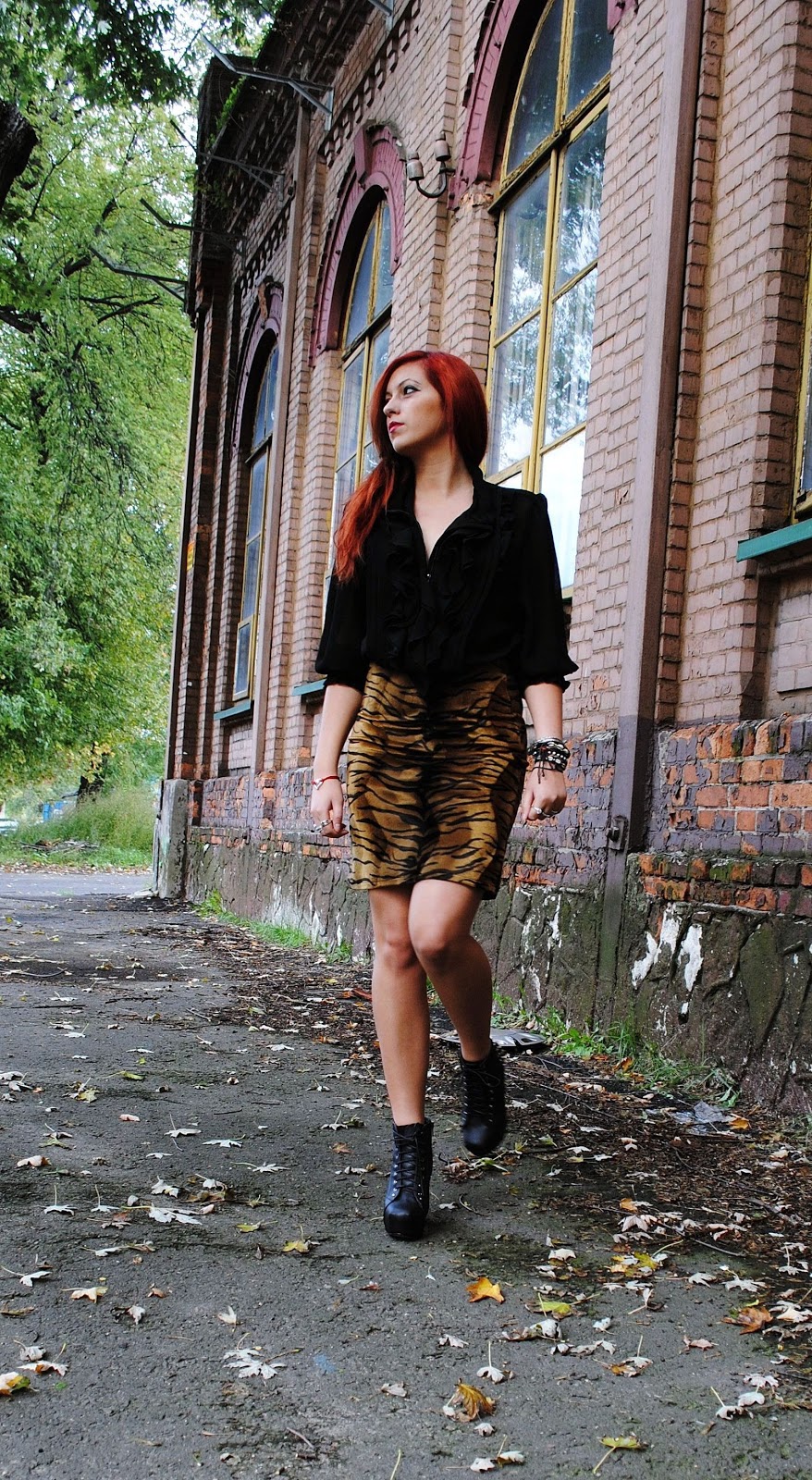 During this season I was fascinated by designers like Valentino, Donny Karan, Leonard and Blumarine which presented great fashion shows. I watched creations from those show and I thought : „What a beautiful skirt” and suddenly I realized that my mother had similary skirt in wardrobe, so I went in search of wild cats in her room. As befits the predator, it waited 15 years to be on top again. I added shirt with frill, because let it be more feminine. To add a pinch of predation I wore solid with studs.