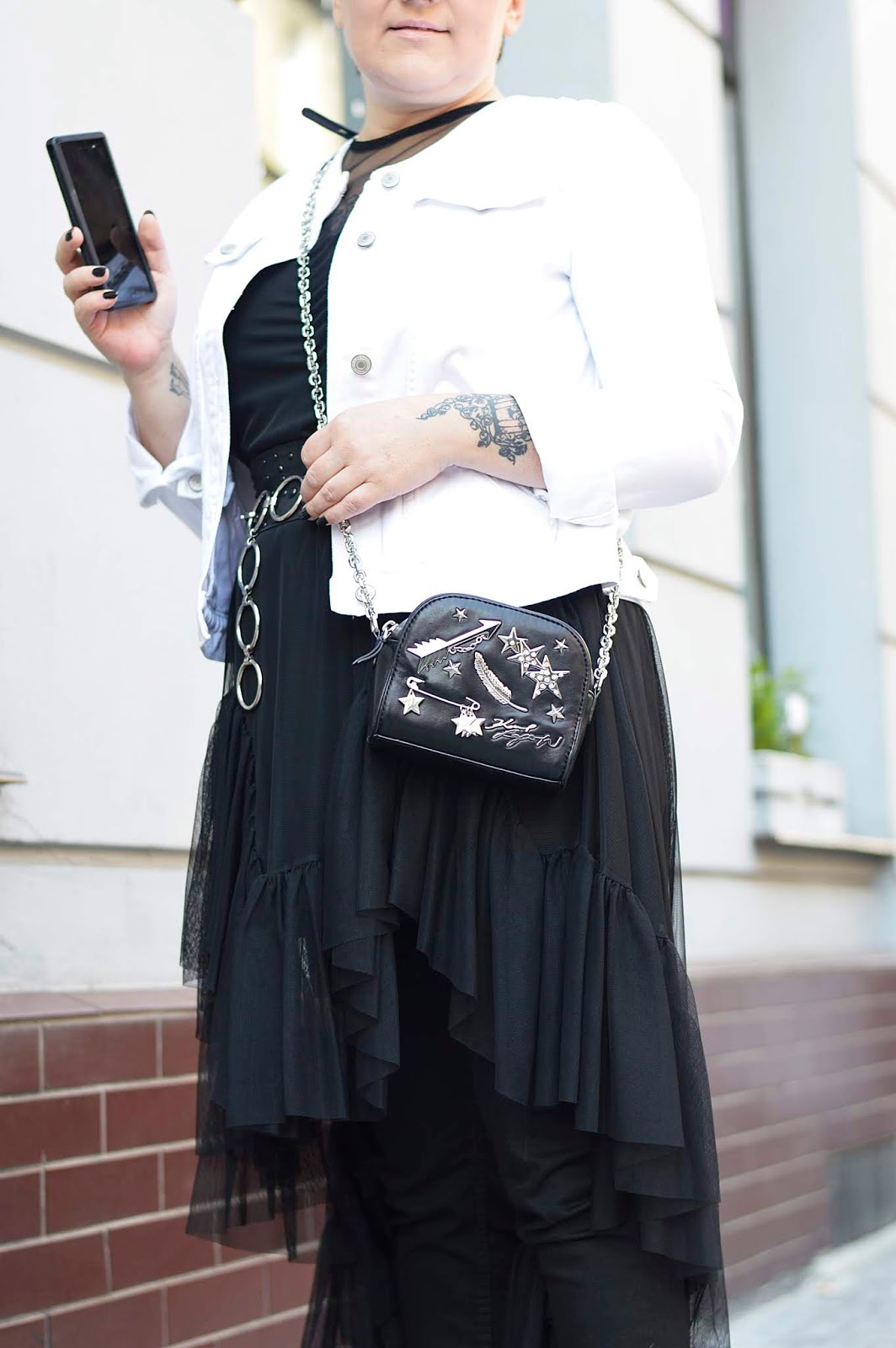 Lekka tiulowa sukienka z falbanami i gruby biały jeans tworzą niebanalny duet. To nowo odkryte przeze mnie połączenie bardzo mi się spodobało. Do tej pory łączyłam tiule z dresową bluzą, swetrem czy skórą. Jak widać to bardzo wdzięczna tkanina, która daje dużo możliwości. Osobiście bardzo lubię takie lekkie dodatki, które dodają lekkiego pazurka.