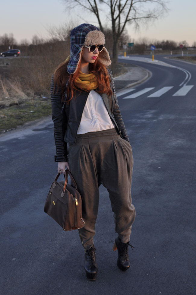 Czapka pilotka to poza beretem i kapeluszem zdecydowanie moja ulubiona. Idealnie wpisała się w klimat. Należy do Atkomka, lecz notorycznie mu ją podkradam. Ten model spodni upodobałam sobie szczególnie.. To już drugie tego typu.. Ostatnio pokazałam Wam cętkowane, tym razem postawiłam na szare. Na koniec kurtka, z którą ostatnio nie mogę się rozstać.