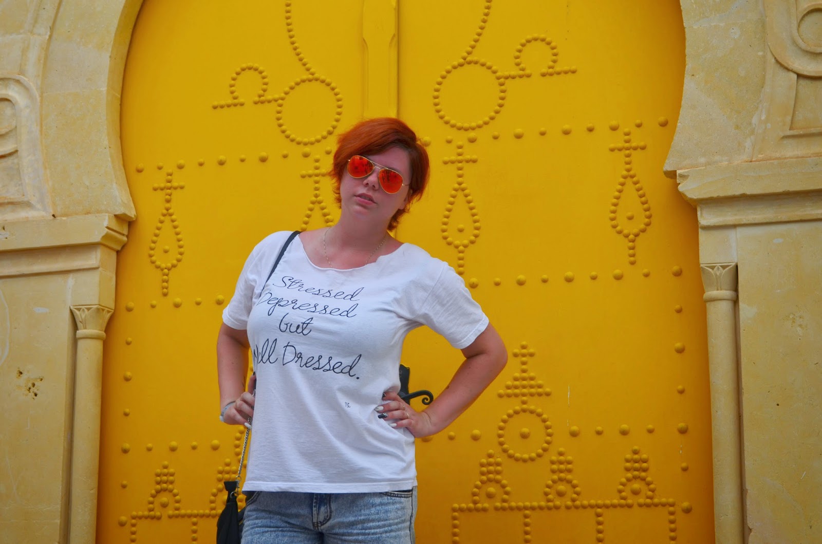Wracając do tematu zdjęć to chciałam z góry przeprosić za głupie miny, brak makijażu i okropną fryzurę. W końcu byłam na wakacjach a nie w pracy, a do tego pogoda nie pozwoliłaby utrzymać się mojemu makijażowi. Jeśli chodzi o włosy to woda w Tunezji jest na tyle beznadziejna, że tona maseczek na włosy nie była w stanie sobie z nią poradzić i moje włosy w połączeniu z chlorowaną wodą w basenie wyglądały jak widać^^ A zdjęcia, mój wygląd, miny to totalny spontan. Nic tutaj nie było stylizowane, ustawiane, chciałam Wam pokazać rąbek prywatnego "nie blogowego" życia. Za koszulki dziękuję sklepowi I&G DIY FOR YOU ( ręcznie malowane koszulki i spodenki DIY ).