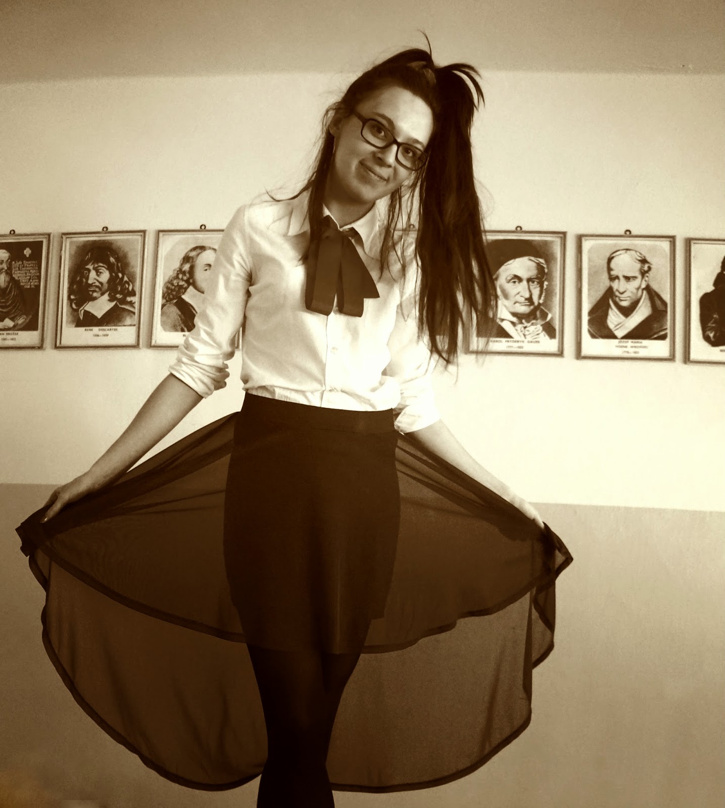 Szukamy z koleżanką pustej klasy, już wchodzimy do jednej, gdy widzimy tam nauczyciela w progu, więc się cofamy. Zapytał
