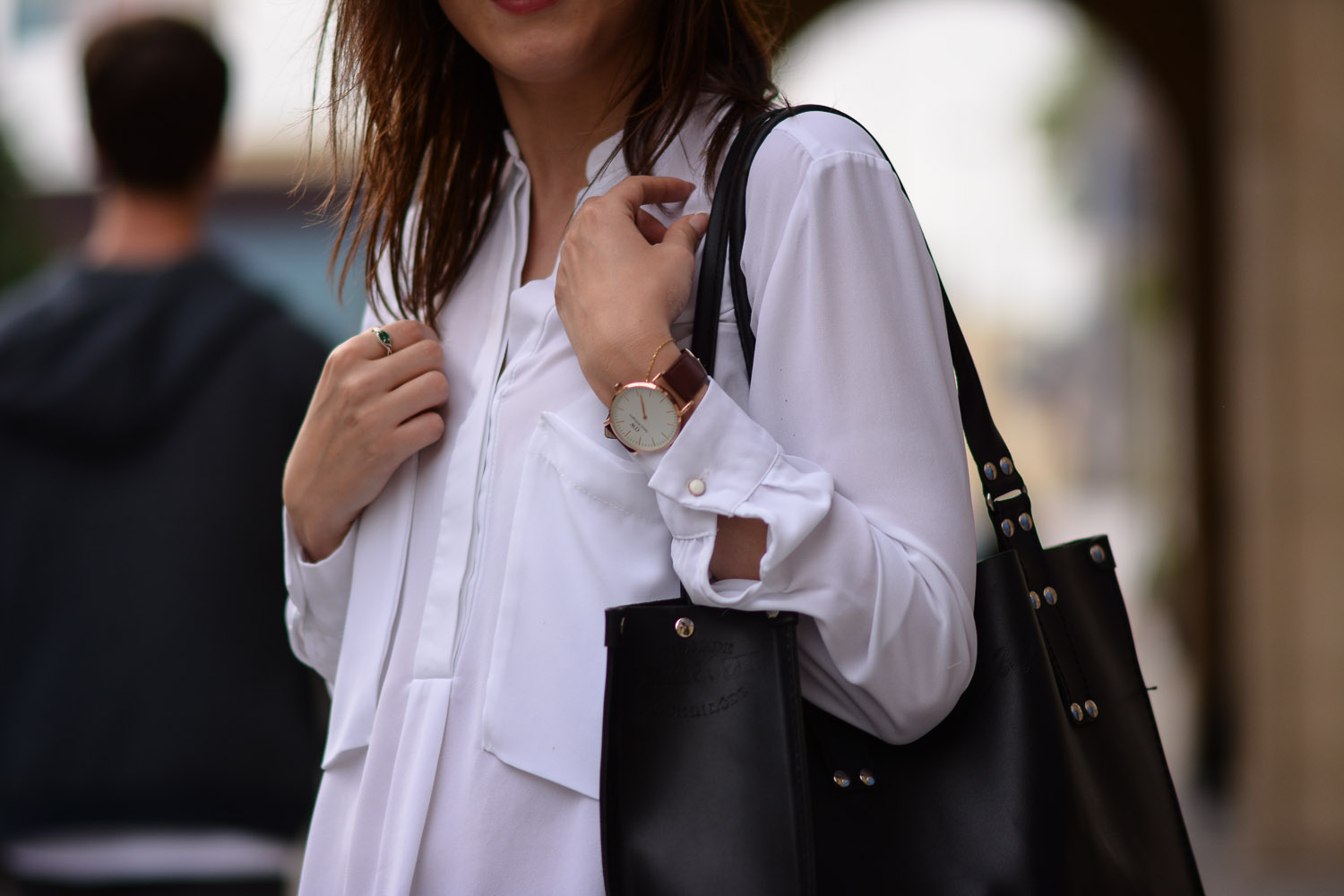 Ze znienawidzonymi pod koniec podstawówki dzwonami pogodziłam się już jakiś czas temu. Fason ten świetnie wyrównuje proporcje sylwetki i wydłuża optycznie nogi. Niestety, nie mam chyba szczęścia do kupna spodni. Dlaczego? O tym poniżej.Dzwony z H&M, które mam na sobie leżą świetnie. Są elastyczne i nie za długie (jak większość modeli, które przymierzałam). Niestety, mają jeden wielki mankament, który zauważyłam dopiero, kiedy ubrałam je po raz pierwszy w domu. Mianowicie niesamowicie zbierają kurz. Nie tak jak przeciętna czarna rzecz. W przypadku innych spodni, które posiadam wystarczy je otrzepać i paprochy schodzą. Przepiękne dzwony wymagają gruntownego czyszczenia rolką dosłownie co 10 minut, mimo że w składzie mają 95% bawełny.