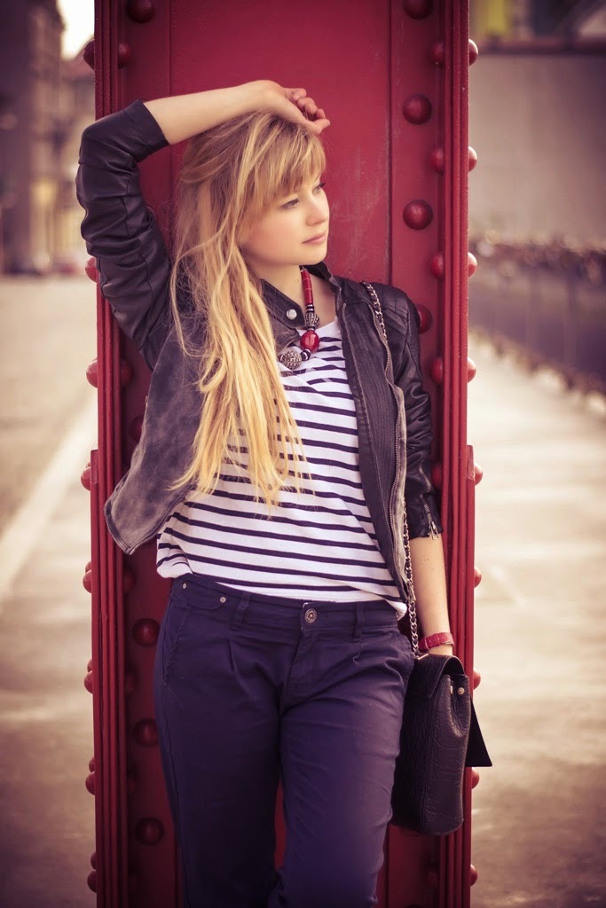 Zobacz oryginał pt., 11/04/2014 - 18:00Typowo wiosenna pogoda, idealna na zestaw ze spodniami i ramoneską w roli głównej. Biel i granat, marynarskie połączenie: założyłam bluzę w paski i granatowe spodnie. Aby dodać trochę elegancji wybrałam czarne szpilki i ramoneskę. Stwierdziłam, że niezbędne będzie dodanie czerwieni do zestawu dlatego zdecydowałam się na duży naszyjnik i zegarek.