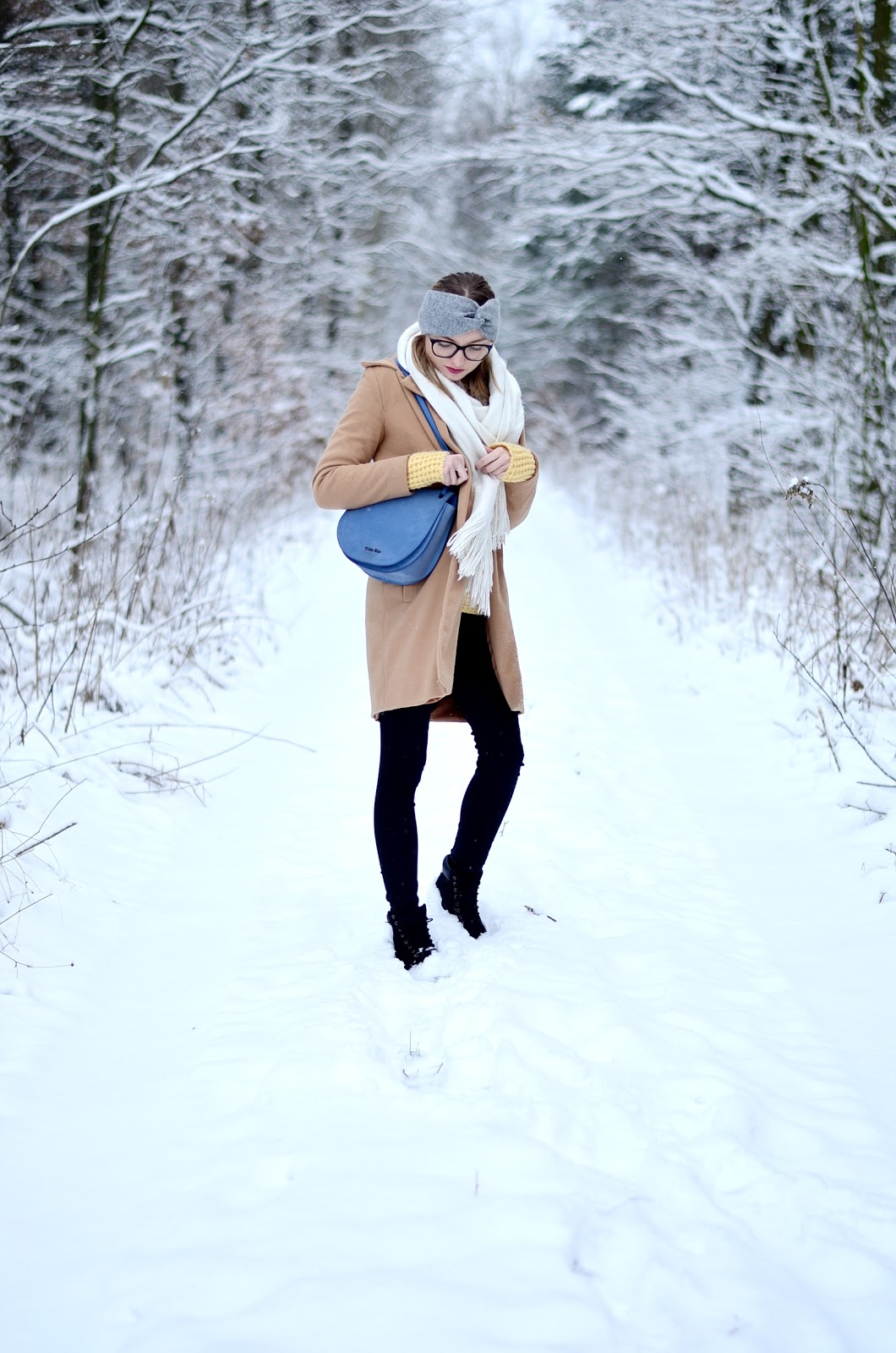 płaszcz- Shein | sweter- Mango | szalik- Reserved | opaska- H&M | buty- Timberland (footway) | okulary- Prada (aurum-optics) | torebka- Calvin Klein (americanoutlet) | pierścionek- byDziubeka
