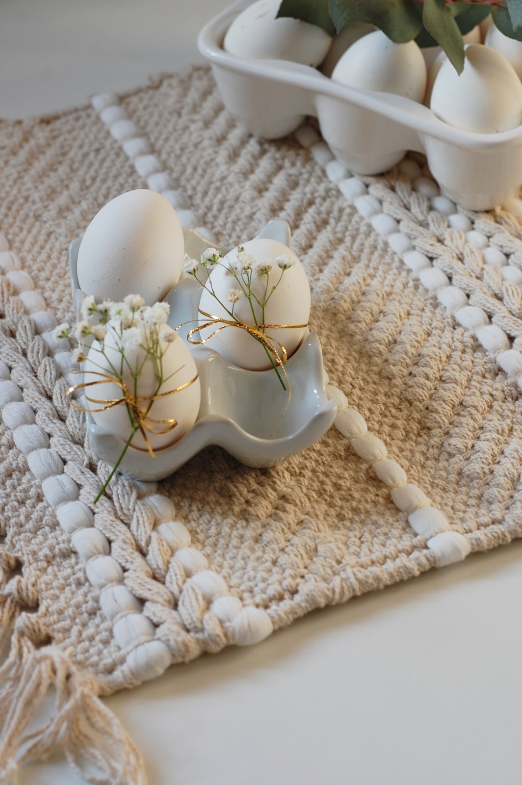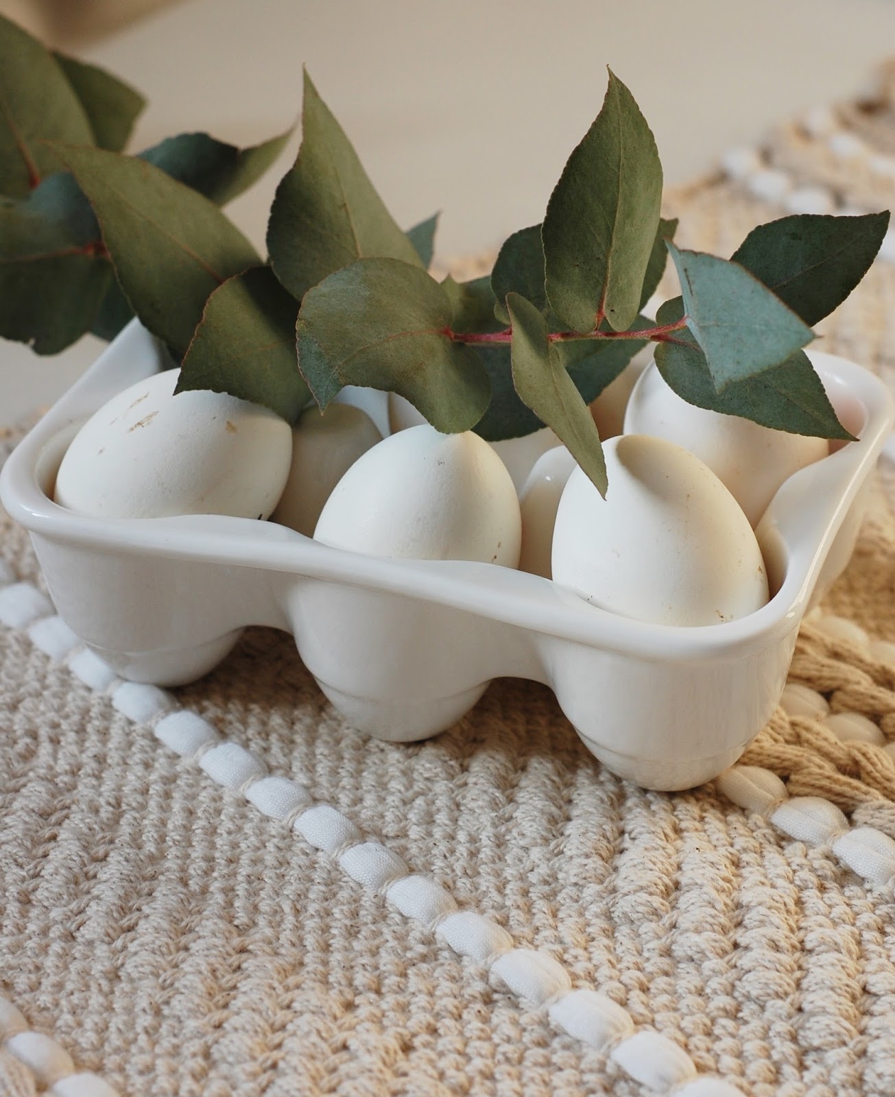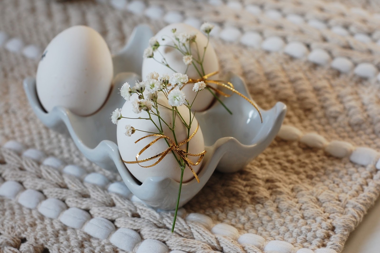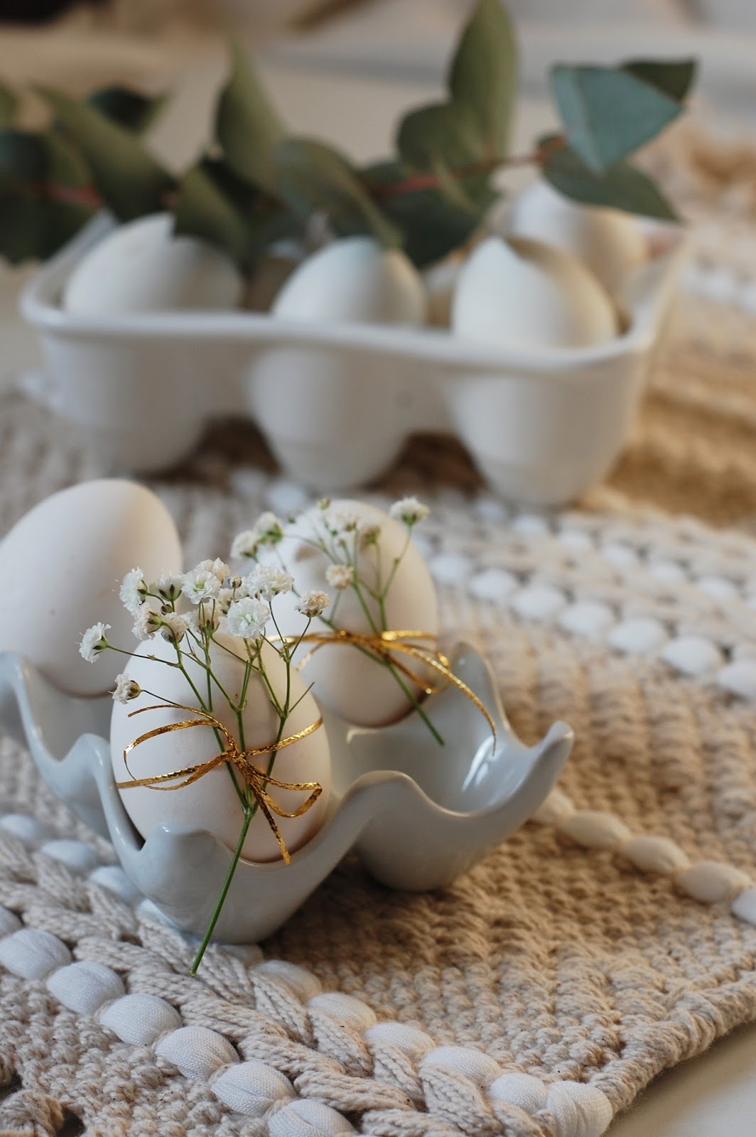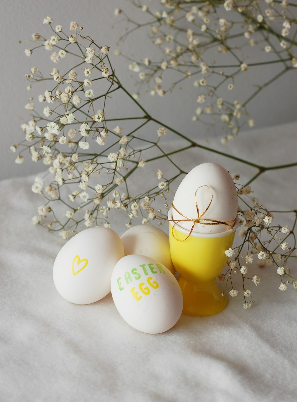 W zeszłym roku zakochałam się w jajkach opublikowanych na instagramie MARTIDAMSKA. W tym roku dorwałam na rynku te w białych skorupkach i postanowiłam się zainspirować i stworzyć ich własną wersję. Efekty możecie zobaczyć poniżej. Pierwsza opcja to śpiące aniołki z koroną z gipsówki - wiosennie i uroczo. Mając już pod ręką ową gipsówkę możemy po prostu przewiązać pisanki wstążką i wetknąć jej małą gałązkę. Możemy również wykorzystać bukszpan czy młode gałązki wierzby. Jeśli chcemy dodać trochę koloru to warto wykorzystać małe stempelki i "nadrukować" napisy lub znaki na pisance. Takie dość minimalistyczne pisanki są świetną alternatywą dla tradycyjnych pisanek farbowanych naturalnie lub barwnikami, oklejone folią czy kraszanek i skrobanek.