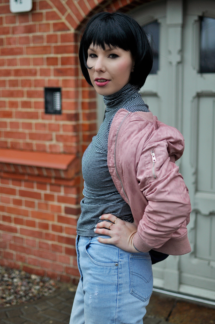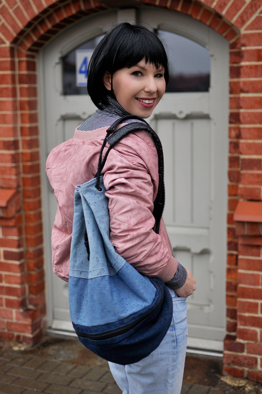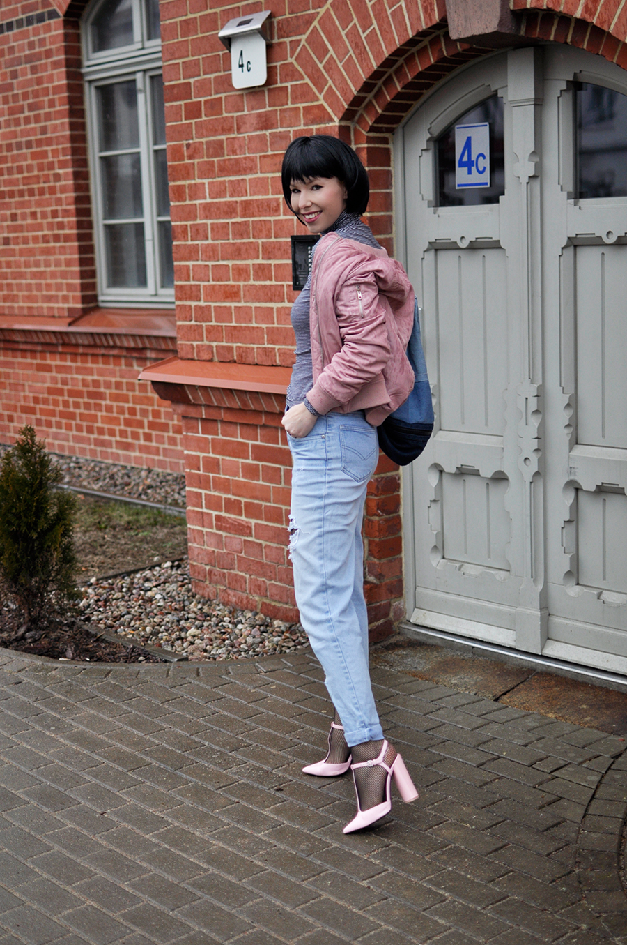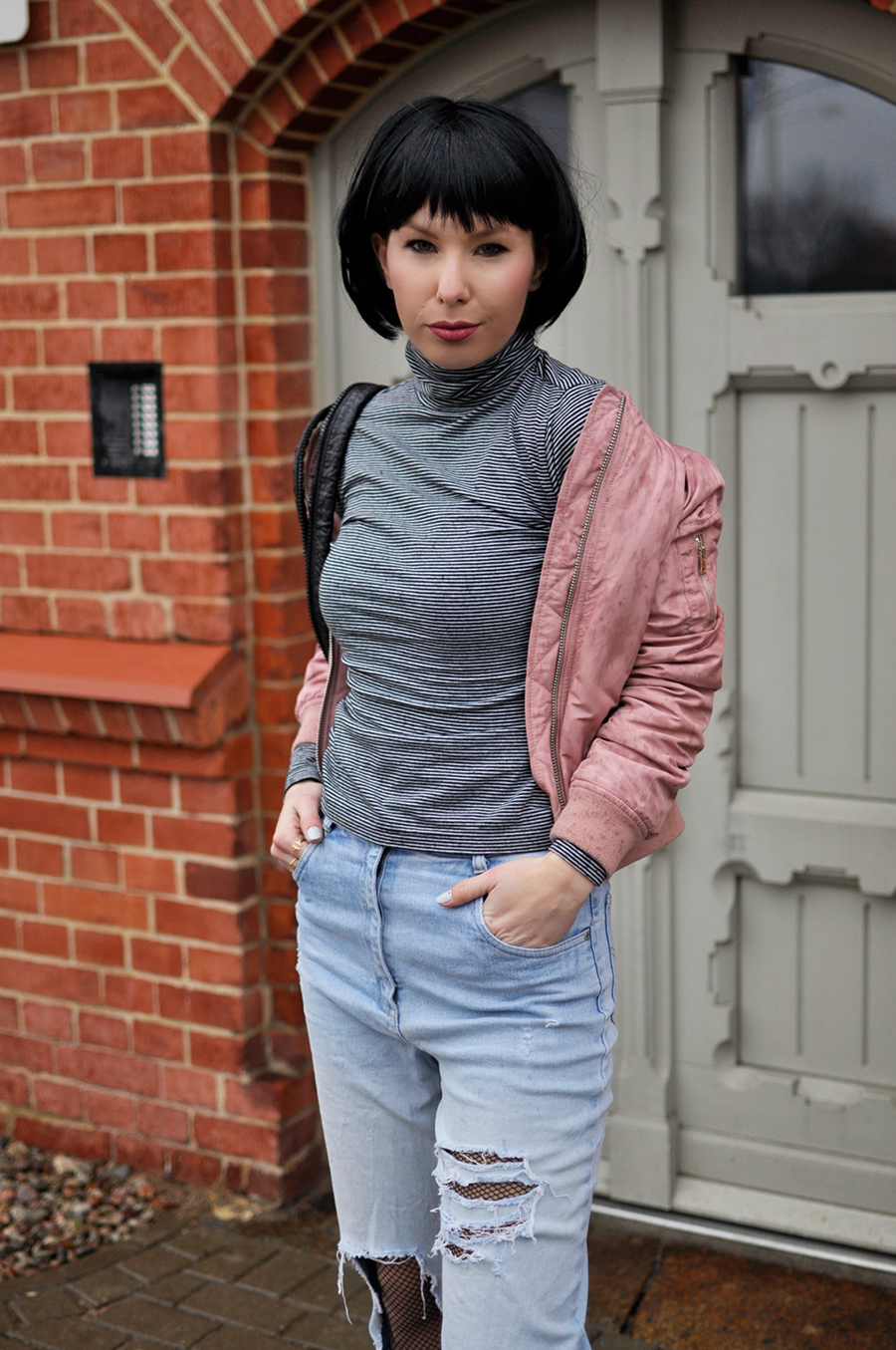 Pudrowy róż to pierwsze po co sięgam, stęskniona za wiosną. By ją przywołać, nieśmiało łączę go z granatem i szarościami, lub tak jak w dzisiejszym zestawie, z jeansem i czernią :)