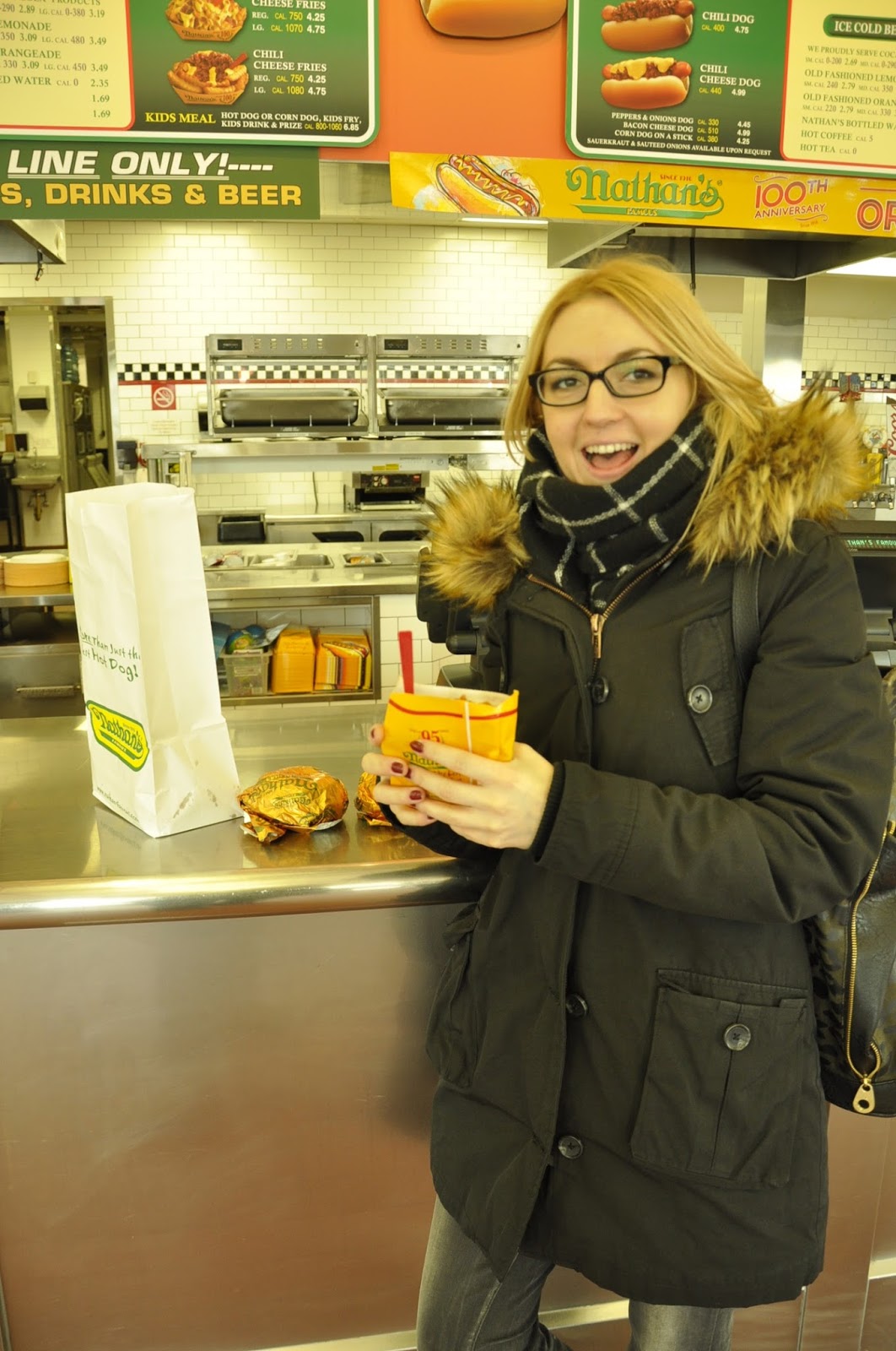 Ze stacji metra do plaży jest niedaleko, plaża szeroka, deptak szeroki, wszystko takie amerykańsko szerokie. Gdyby nie było tak zimno, warto zrobić spacer z Brighton Beach do Coney Island. Tam jednak podjechałyśmy 2 przystanki metrem. Pewnie każdy kojarzy wesołe miasteczko i molo. Zanim jednak poszłyśmy nacieszyć oczy bezkresem, postanowiłyśmy dać kolejną szansę kuchni amerykańskiej. Okazja nadarzyła się przednia, ponieważ przed nami wyrósł lokal Nathan's Famous Hot Dog & Restaurant, którego punkty już nam wpadły w oko na Manhattanie. "Restauracja" obchodzi w tym roku swoje stulecie i wił sie tam dziki tłum, więc chyba warto pokosztować lokalnej tradycji. Nie warto. Ale o tym wtedy jeszcze nie wiedziałyśmy. Każda z nas zamówiła po zestawie (1880 kcal!!!!). Zjadłyśmy. Gumowe frytki i mdłego hambuksa. Never ever.