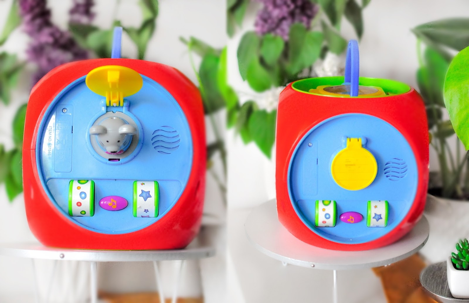 Co do opcji jakie znajdziemy w Pudełku Uczydełku to myślę, że każde dziecko znajdzie coś dla siebie. Młodszy syn najbardziej lubi chowającą się i wyskakującą myszkę, starszy natomiast uwielbia włączać i wyłączać na kostce pralkę. Nie uwierzycie, co nawet wymyślił. Na kręcący się element pralki położył nawet swoją plastikową butelkę z piciem i patrzył jak się fantastycznie kręci.