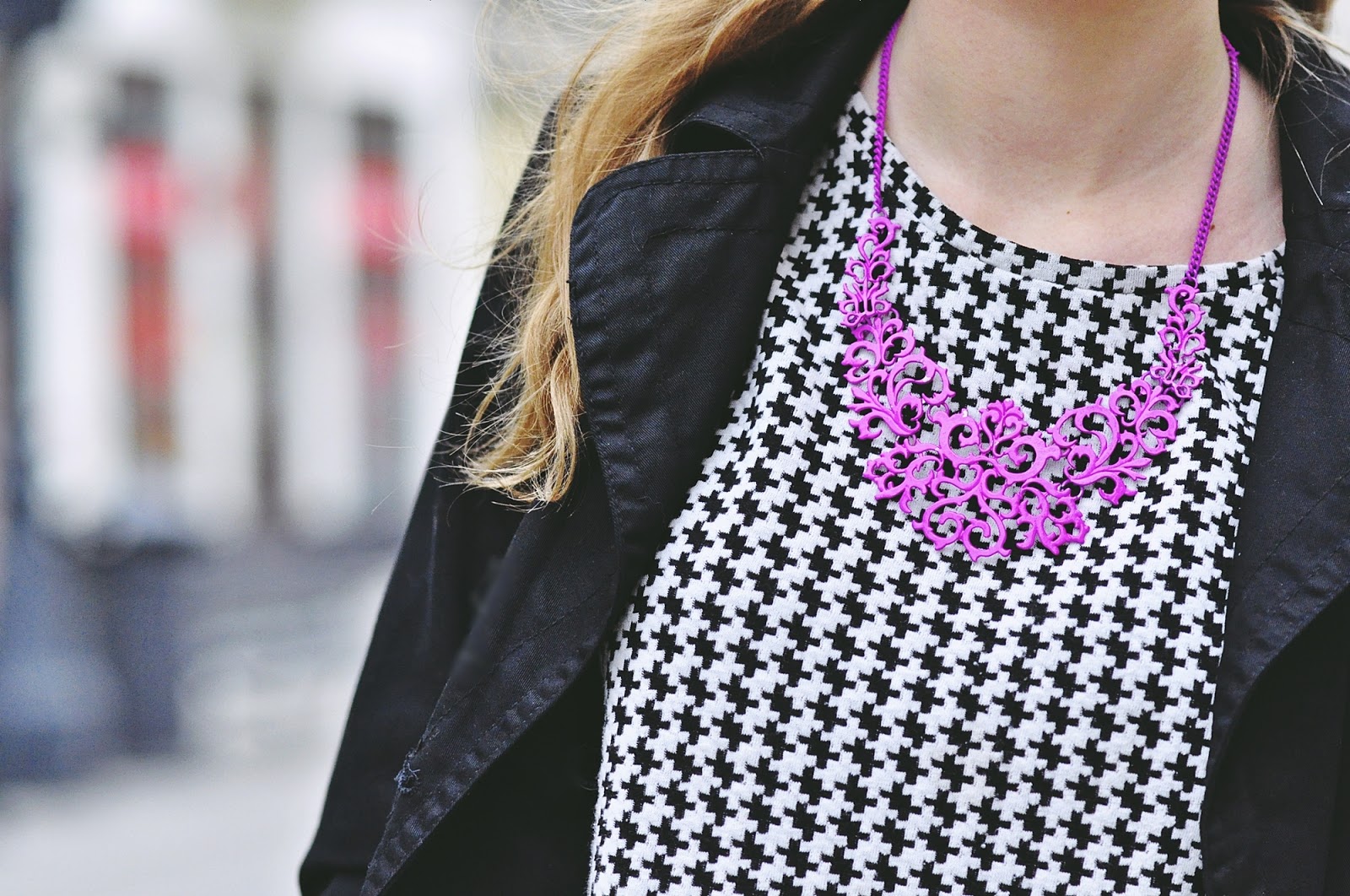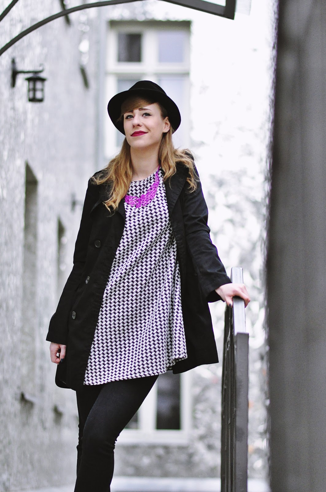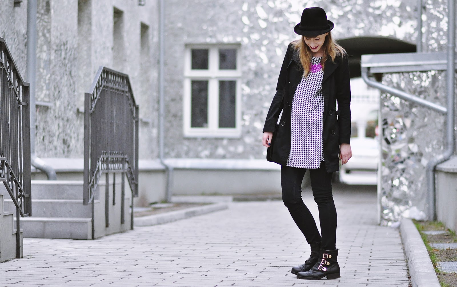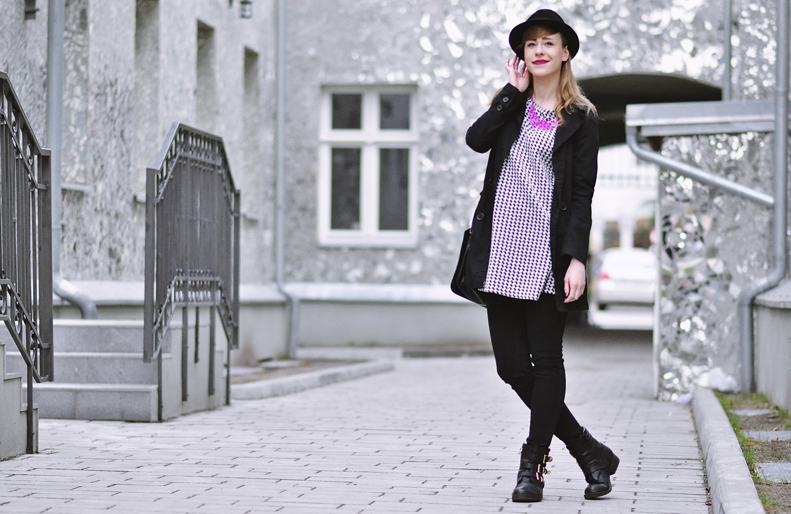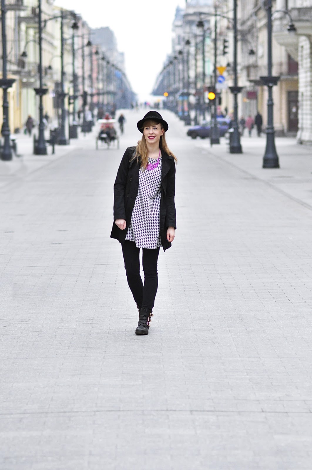Co do zestawu, to mam na sobie dwie nowości, pepitkową tunikę i spodnie, czyli moje lumpeksowe zdobycze. Dodatki już znacie, bo oprócz naszyjnika, który kupiłam na AliExpress, są powtórką z poprzedniego outfit'owego wpisu.