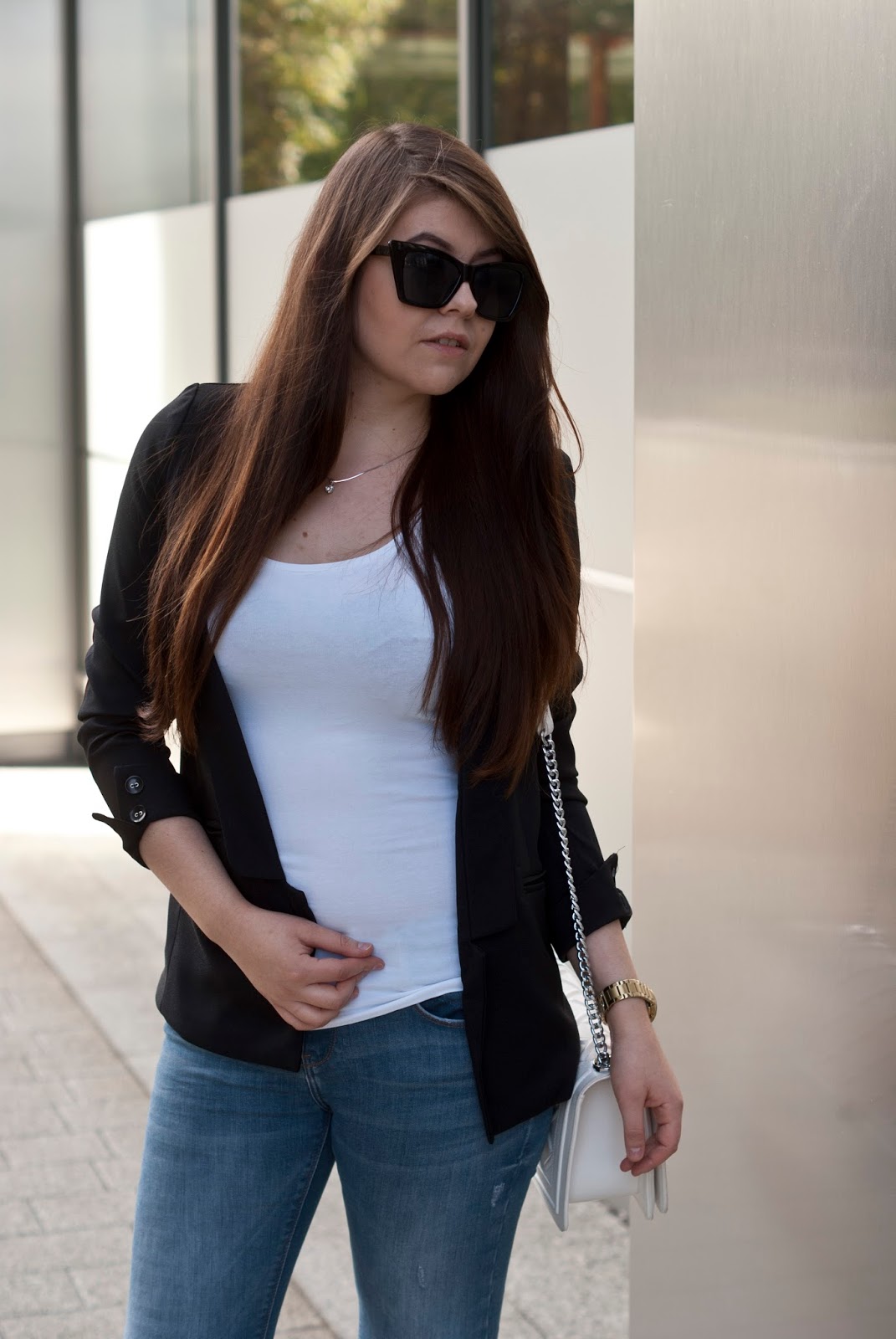 Witajcie, dzisiaj bardzo klasycznie. Myślę że każda z nas ma w szafie biały top, klasyczną czarną marynarkę i idealnie dopasowane jeansy. Taki zestaw sprawdzi sie wszędzie! W szkole, w pracy, na spotkaniu z koleżankami czy też  niespodziewanej randce z chłopakiem.