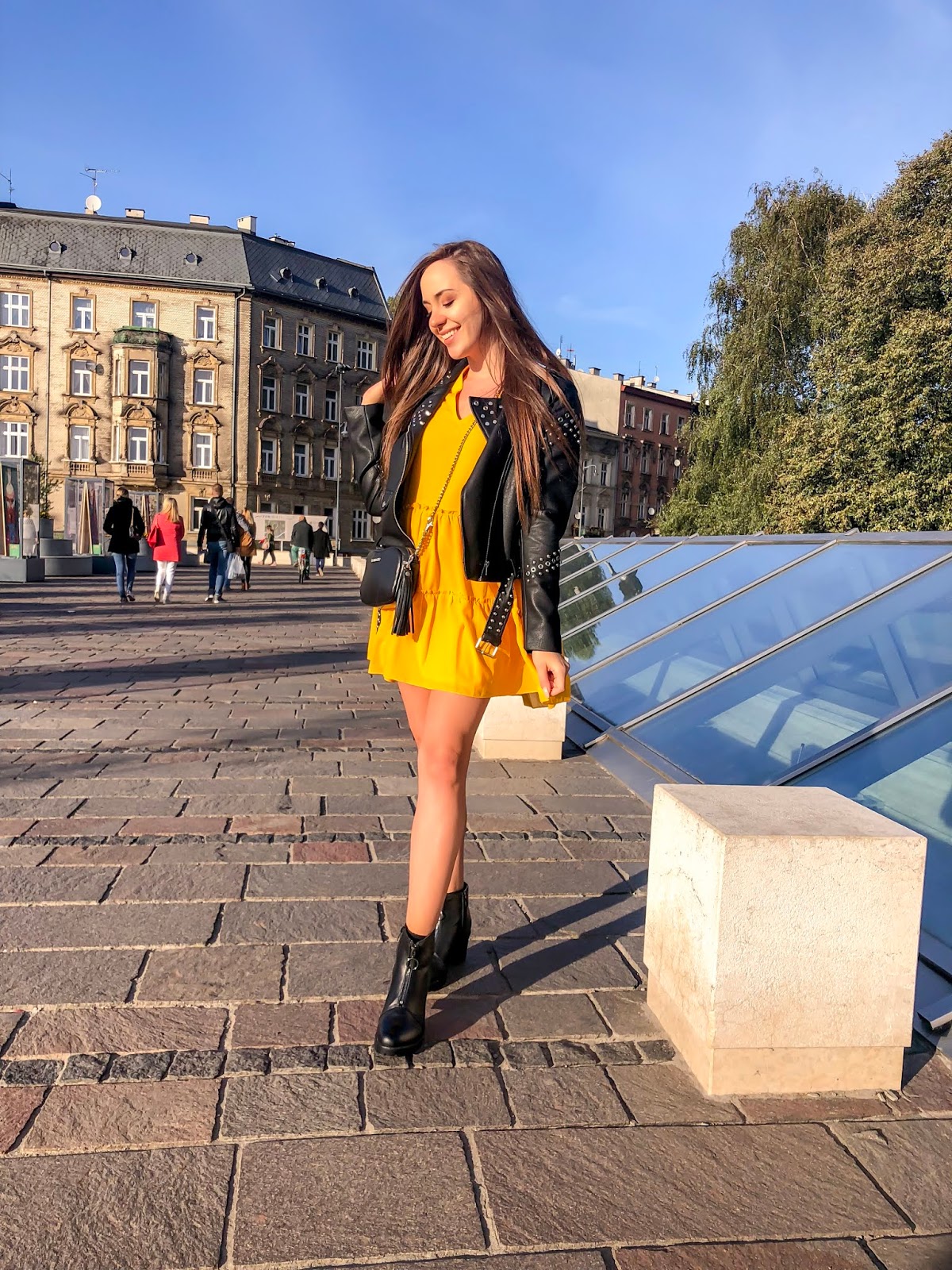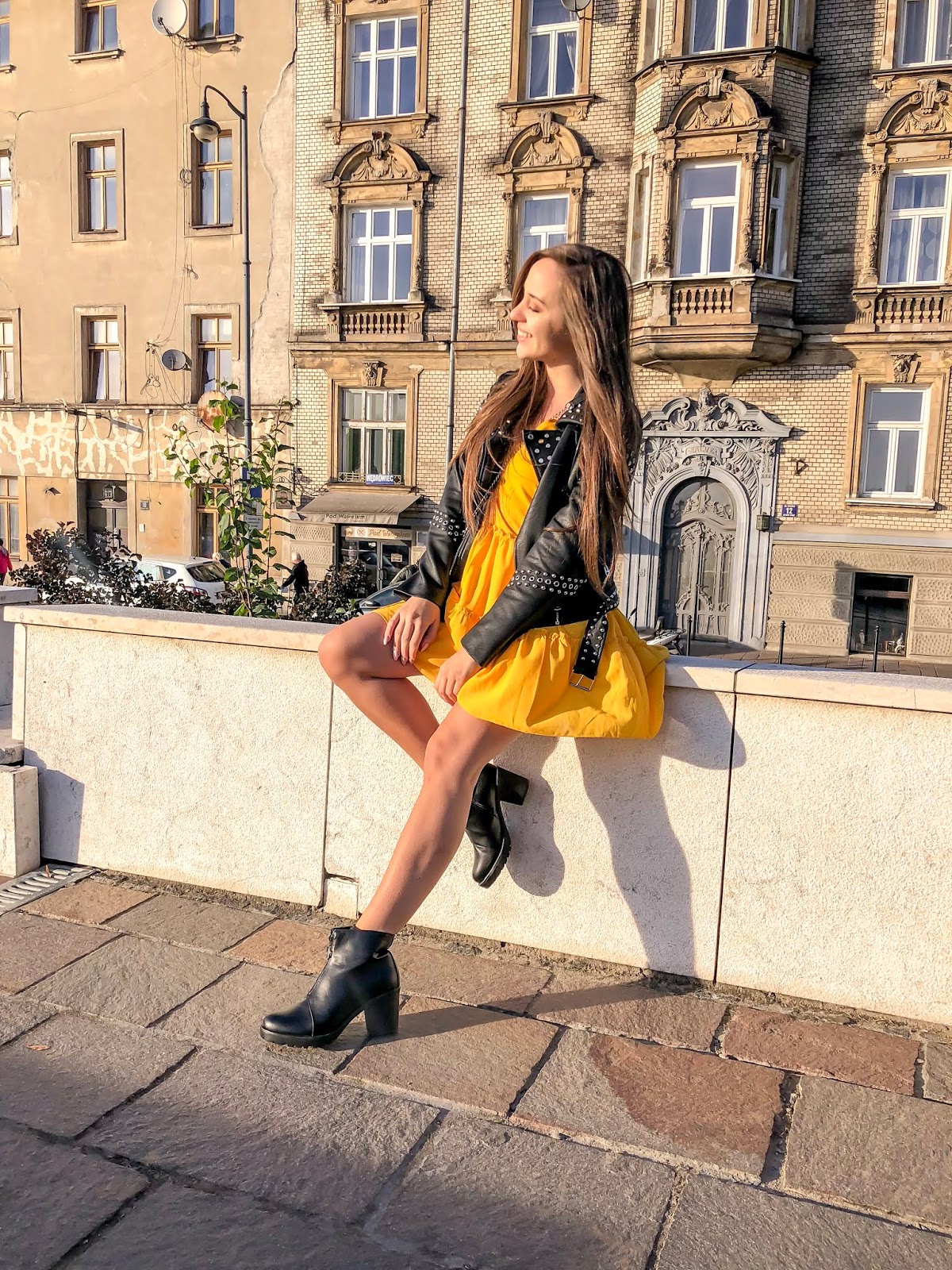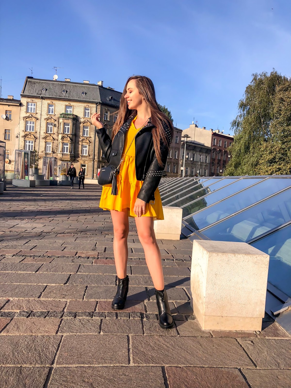 Zobacz oryginał sob., 20/10/2018 - 15:00Witajcie:) Tegoroczna jesień wyjątkowo rozpieściła nas dużą ilością słońca i ciepła, dzięki temu można było poszaleć również ze stylizacjami i postawić na żywe kolory. Jestem zachwycona żółtą sukienka, tak naprawdę robi cały zestaw. Świetnie wygląda z ciężkimi dodatkami, które dobrałam - ramoneską z ćwiekami i botkami, ale zarówno z delikatnymi szpilkami czy trampkami w wersji bardziej letniej;) Jak Wam się podoba całość?