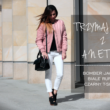 TRZYMAJ STYL Z ANETTE: ZESTAW Z RÓŻOWYM BOMBER JACKET 3 - BIAŁE RURKI I CZARNY T-SHIRT