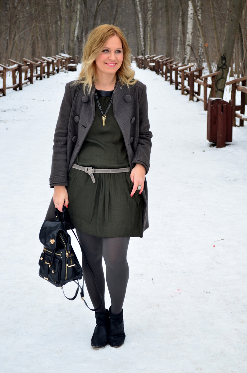 Zobacz oryginał czw., 21/02/2013 - 22:21 Zakochałam się w trochę niekobiecych plecakach, może dlatego, że lubię wygodę. Nadają charakteru każdej stylizacji. Podobają mi się i te plecione w stylu boho i w kwiecisty print na lato. Dzisiaj prezentuję Wam plecak w eleganckim stylu zakupiony w Accessorize na przecenie. Założyłam do niego wygodną sukienkę z Zary (przeceniona na 49 zł ze 199 zł) i pożyczony od Mamy wełniany płaszczyk z second handu za 30 zł (Zara). Sukienka bez paska była nudna więc założyłam szary, skórzany pasek z New Look. Lubię takie monochromatyczne zestawy.