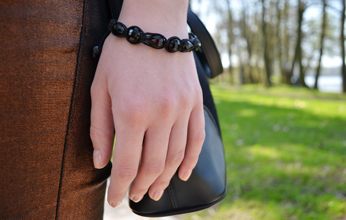 Zobacz oryginał ndz., 20/04/2014 - 20:29 Dzisiaj chcę Wam pokazać stylizację, do której użyłam błyszczących spodni, które upolowałam na wyprzedaży. Dobrałam do nich czarną koszulkę z falbankami po obu stronach. Dodatkami są czarne szpilki ze srebrnymi zapięciami, czarna torebka, którą mieliście okazję zobaczyć już w kilku poprzednich stylizacjach oraz sowie kolczyki. Całość jest stonowana, jednak spodnie nadają całości ciekawego , nieco rockowego charakteru.