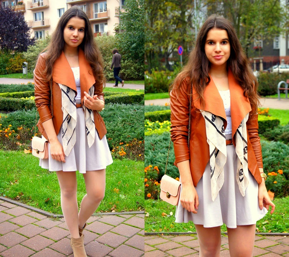 Zobacz oryginał wt., 21/10/2014 - 20:58Witajcie:) Dzisiaj stylizacja, jak możecie zauważyć w tytule z brązowym elementem. A jest nim skórzana kurtka, a właściwie narzutka. Kolor brązowy nie jest łatwym kolorem "w noszeniu". Styliści piszą: nie łączyć z czarnym , zielonym, czerwonym... A więc z czym go nosić? Wydaje mi się, że jeśli nie mamy zupełnie koncepcji i pomysłu na ten kolor, możemy śmiało go połączyć z białymi, kremowymi bądź beżowymi kolorami. Wtedy na pewno nie popełnimy modowej wpadki:) Dzisiaj taka właśnie "bezpieczna propozycja" w moim wydaniu. Mam nadzieję, że wam się spodoba:)