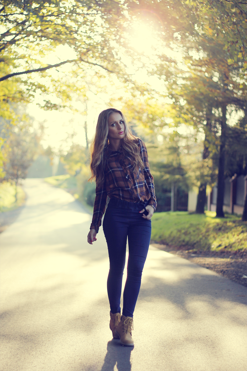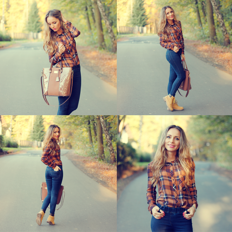 Również dzisiejsza sesja oddaje klimat tych pięknych jesiennych dni, przez wgląd na panujące temperatury, bez ciężkich wierzchnich ubrań założyłam luźny zestaw, idealny na spacer, koszula w kratę, jeansy i wygodne workery.