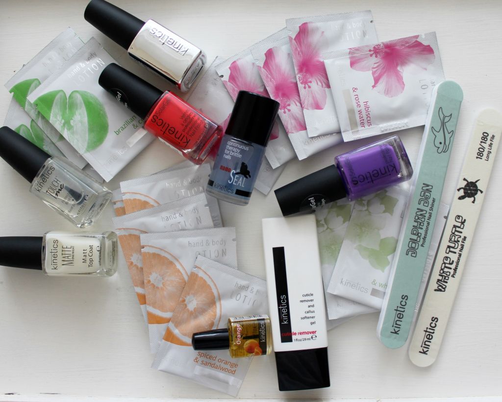 Zobacz oryginał śr., 03/02/2016 - 00:20Hej Lakieromaniaczki ;) W dzisiejszym poście chciałam Wam zaprezentować zawartość cudownej paczki z produktami marki Kinetics. Dzięki nim mogłam przetestować lakiery solarne, które są dosyć nowe na rynku. Wraz z dwoma żywymi kolorami lakierów solarnych z figlarnymi nazwami - KISS AND SMILE 032 i PURPLE MADNESS 089. W paczce, do lakierów dołączony był cały zestaw pielęgnacyjny, a także lakiery 'pomocnicze'- baza pod lakier, top matujący, odżywka, oliwka do skórek i oczywiście top coat solarny, oprócz tego żel do usuwania skórek, dwa pilniczki (pilnik i polerka).