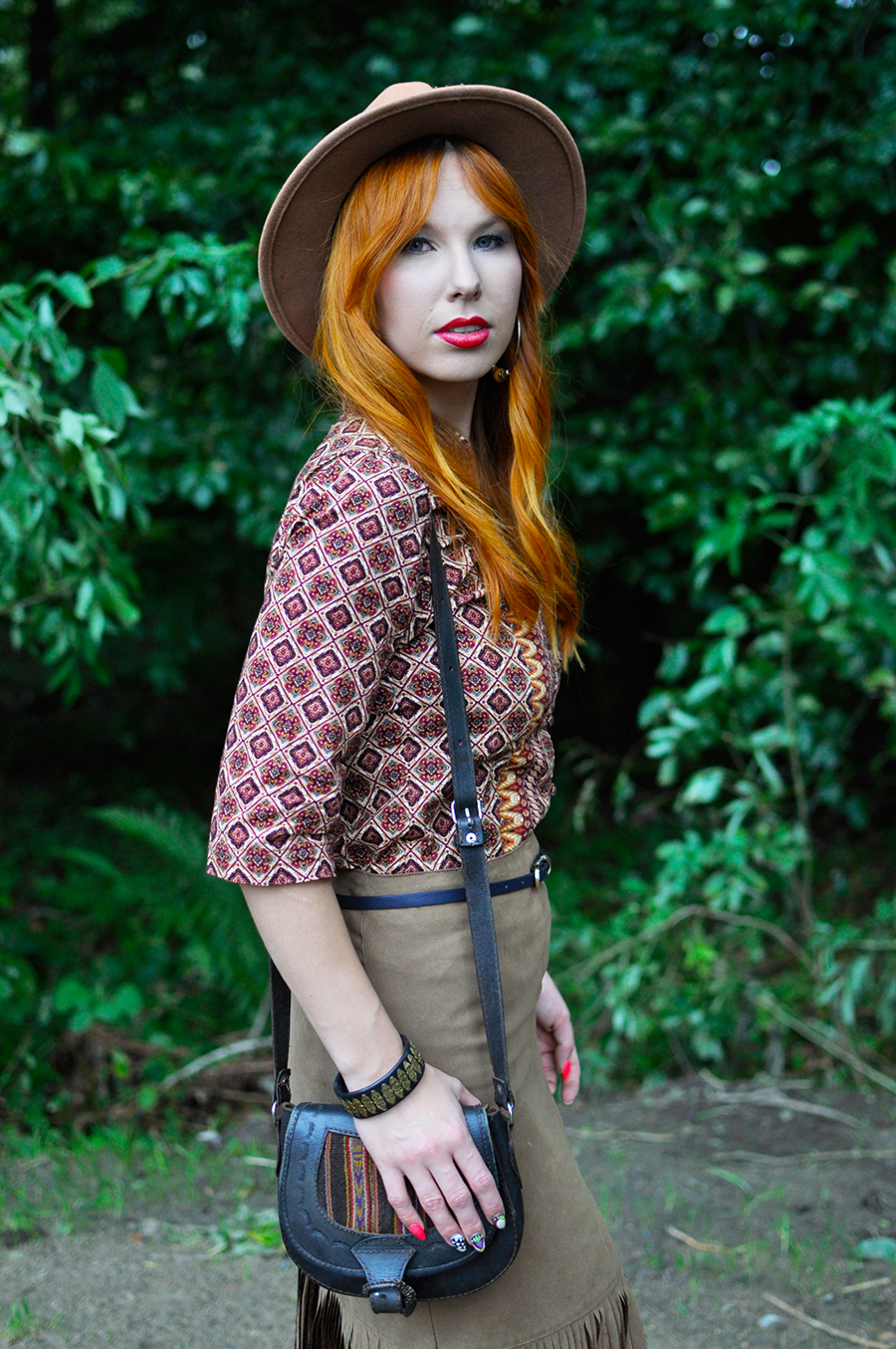 Spódnica z frędzlami zrobiona własnoręcznie, z jakiejś starej lumpeksowej zdobyczy i równie stara lumpeksowa, wzorzysta bluzka. Wyszedł look trochę safari i sceneria też z lekka ten klimat przypomina. Można by rzec Ruda w Puszczy? Może i można.