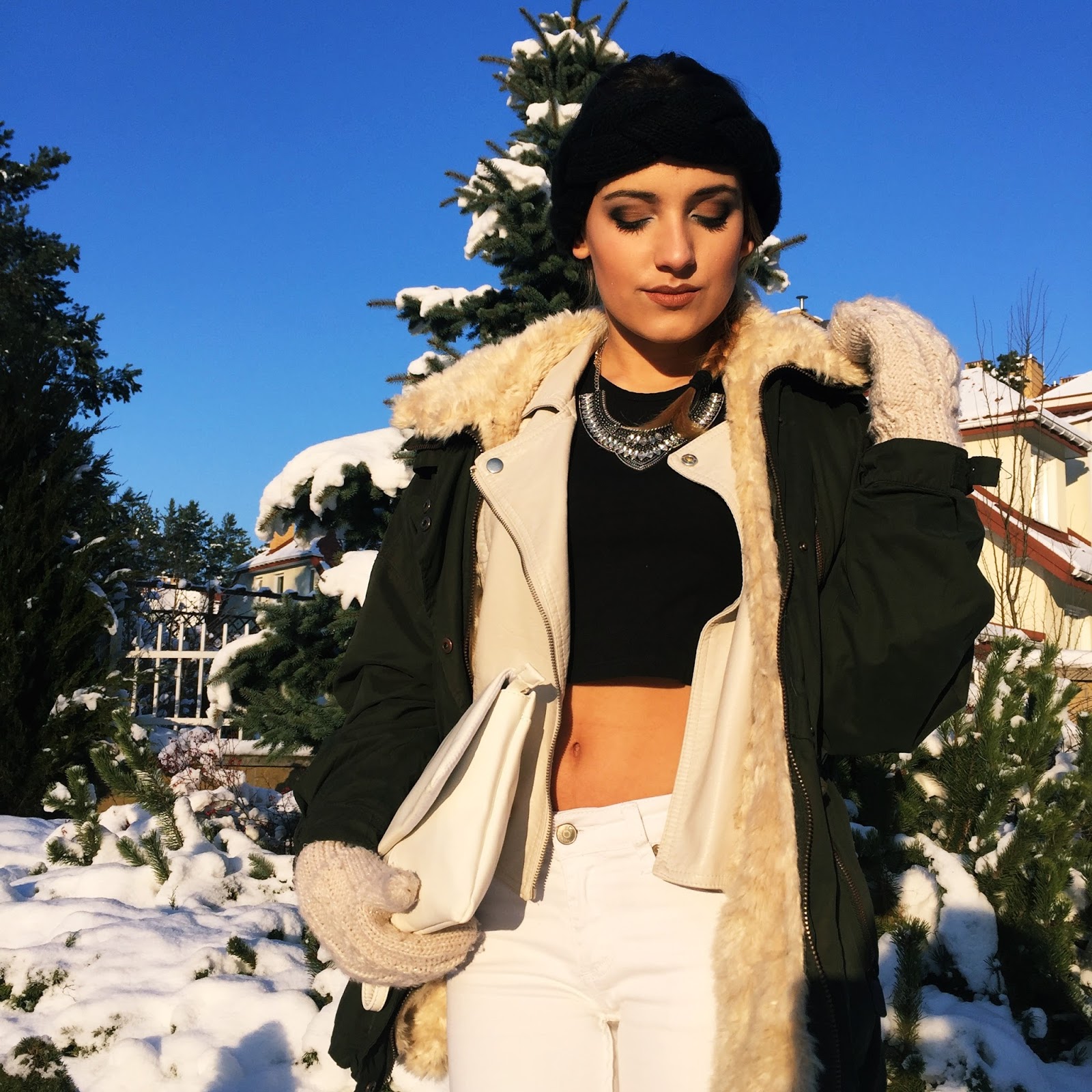 Stylizacja imprezowa jak na takie warunki pogodowe. Połączyłam biel z czernią, gdyż wydała mi się w tym zestawieniu zgrana i odpowiednia. Ze względu na fakt, że zakładałam długie spodnie, postanowiłam odsłonić brzuch, a górę przyozdobić pięknym, dużym, błyszczącym naszyjnikiem.