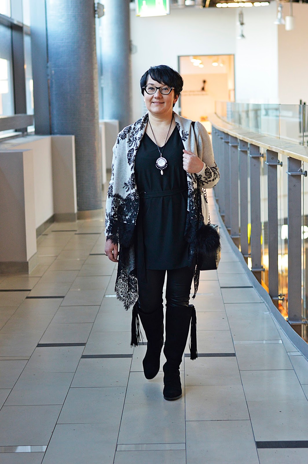 KARDIGAN - BUTIK / TUNIKA - F&F % / NASZYJNIK - WIOLETA / KOZAKI - MOHITO / TOREBKA - WOJAS / FOTO - JUNIOR