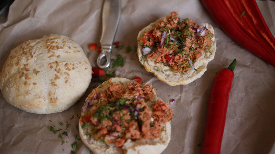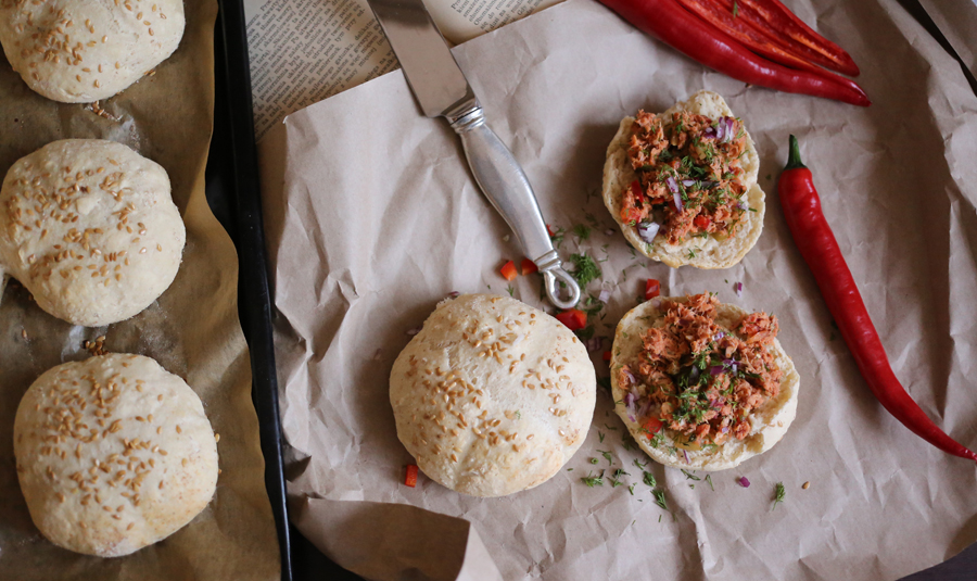 Jeśli znudziły Wam się jajecznice, omlety, kanapki i owsianki to mamy dla Was świetna opcję na niedzielne śniadanko. Robi się je nieco dłużej, dlatego lepiej tego dnia nigdzie się z rana nie spieszyć. Bułeczki pieczemy sami a nie ma na tym świecie nic pyszniejszego od gorącego, świeżego pieczywa. Do tego pasta z wędzonej makreli z warzywami. Makrela jest rybą tłustą, zawiera bardzo duże ilości kwasów omega-3 i omega-6. W trakcie jej kupowania zwróćcie uwagę na kolor, zapach oraz warunki w jakich jest przechowywana. Warto więc poszukać na opakowaniu umieszczonego przez producenta znaku GMP, który ma wskazywać na prawidłowy proces wędzenia. W przygotowywaniu śniadanka pomagała mi mama, bez niej by się nie udało. Polecam wypróbować przepis, zwłaszcza bułeczki. Oczywiście zamiast pasty możecie wykorzystać cokolwiek, ulubione warzywa i wędliny.