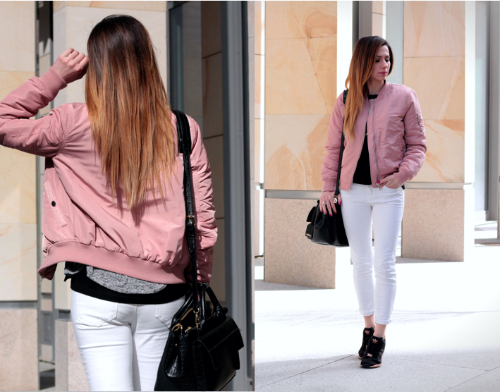 TRZYMAJ STYL Z ANETTE: ZESTAW Z RÓŻOWYM BOMBER JACKET 3 - BIAŁE RURKI I CZARNY T-SHIRT