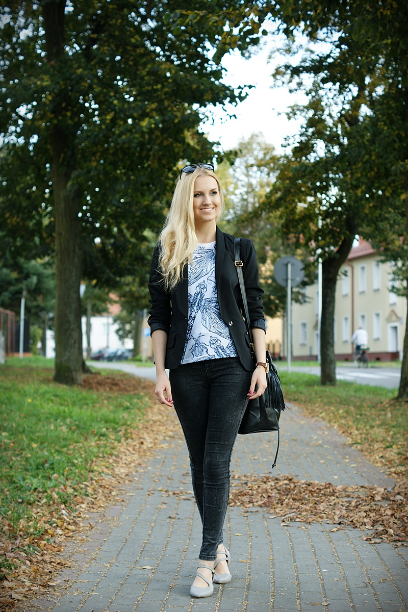 marynarka / jacket - rozmiar34, koszulka / t-shirt - More'moi, dżinsy / jeans - Reserved, baleriny / ballerina - Noevision, torba / bag - Manzana, zegarek / watch - Techtime, okulary / sunglasses - eOkulary
