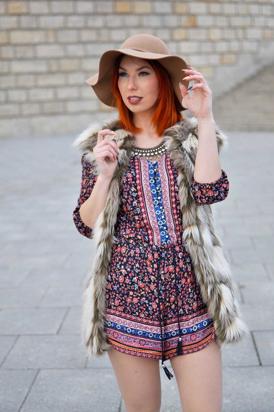 kombinezon BERSHKA futro ZARA buty QUAZI naszyjnik STRADIVARIUS kapelusz RESERVED