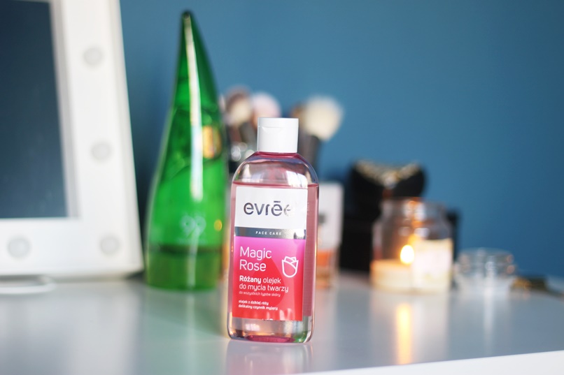 Do oczyszczania twarzy używam tłustego, olejkowego produktu marki Evree, który w rzeczywistości jest po prostu oliwką hydrofilną. To znaczy, że po porządnym wymasowaniu twarzy za jej pomocą, co dokładnie rozpuszcza i usuwa makijaż, emulgujemy produkt wodą. Olejek zmienia się wtedy w delikatną piankę i bardzo ładnie zmywa się z twarzy wraz z wszelkimi zanieczyszczeniami. Po użyciu olejku, wacik z płynem micelarnym jest praktycznie czysty, jeśli przetrzemy nim twarz. Większość kosmetyków do makijażu rewelacyjnie rozpuszcza się przy użyciu oleju, dotyczy to trwałych podkładów, tuszy, pomad do brwi. Kiedy muszę umyć buzię bez użycia tego olejku, to przyznaję - okropnie się męczę! Wadą tego produktu jest opakowanie - trudno dozować odpowienią ilość, bo to po prostu zwykła butelka, jednak skład dużo wynagradza. Miałam już kiedyś podobny produkt z Bielendy w lepszym opakowaniu, z pompką, ale na pierwszym miejscu w składzie miał parafinę, a moja skóra źle na nią raguje. Olejek w zależności od drogerii i ewentualnej promocji kosztuje od 15 do 25 zł.