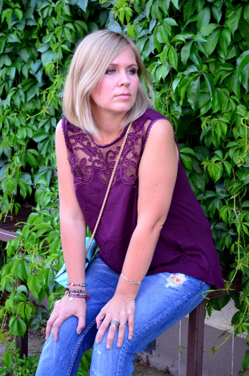 Zobacz oryginał pt., 12/07/2013 - 20:24 Witam Was dość letnią stylizacją. Kocham boyfriendy od niedawna ale to już wiecie. Bardzo łatwo do nich dobrać górę. Każda elegancka bluzka zestawiona z tymi jeansami sprawi, że stylizacja będzie miała "charakter". Ja zdecydowałam się na bluzkę z ciucholandu w kolorze śliwkowym (doskonały kolor dla blondynek) z piękną górą z gipiury. Żeby całość nie miała sportowego charakteru założyłam wrzosowe czółenka. "Miętowa" torebka fajnie kontrastuje z śliwkowym odcieniem góry. Nie mogło zabraknąć biżuterii. Kolorystycznie pasujące bransoletki i dużo "obrączkowych" pierścionków.